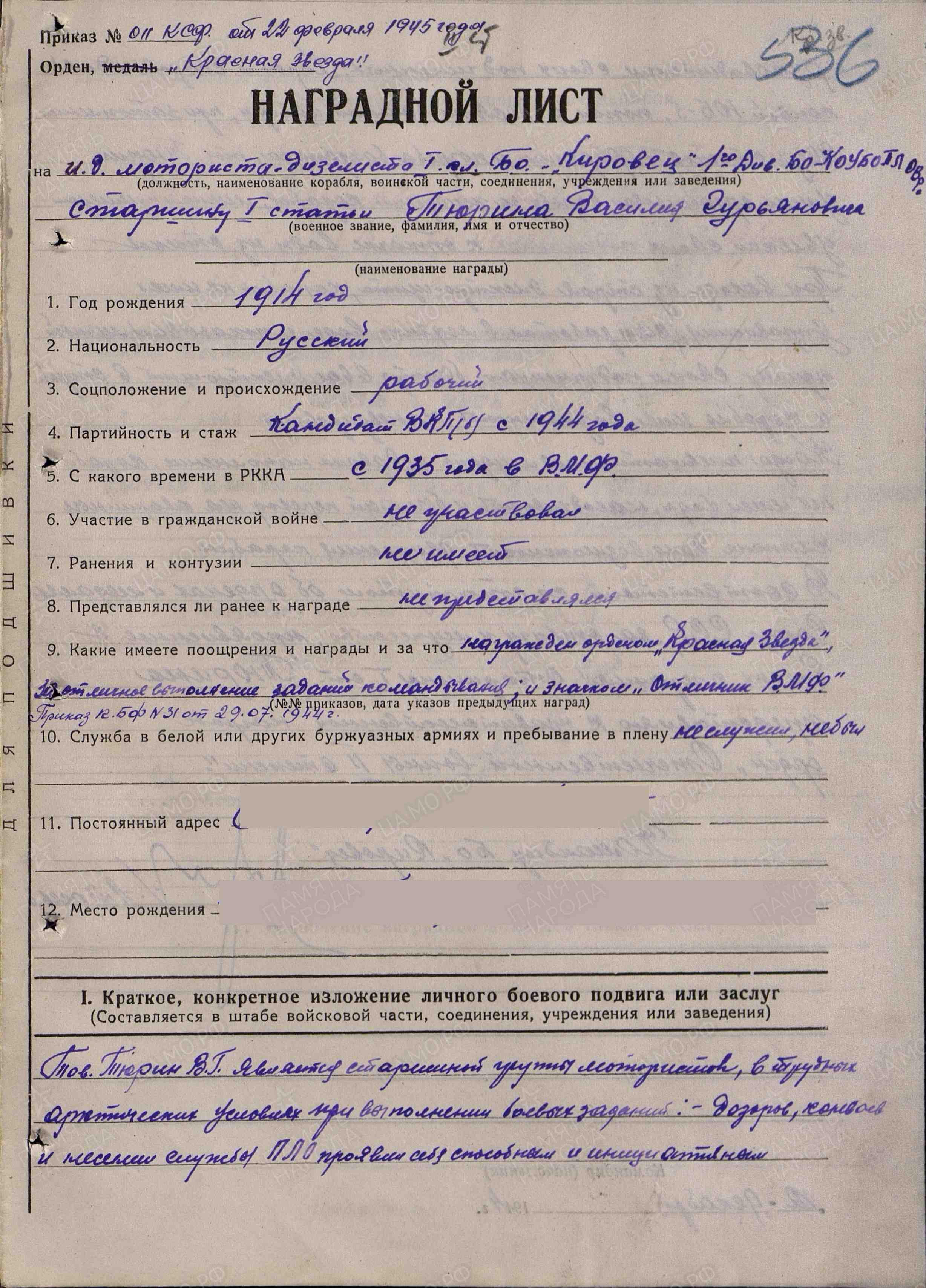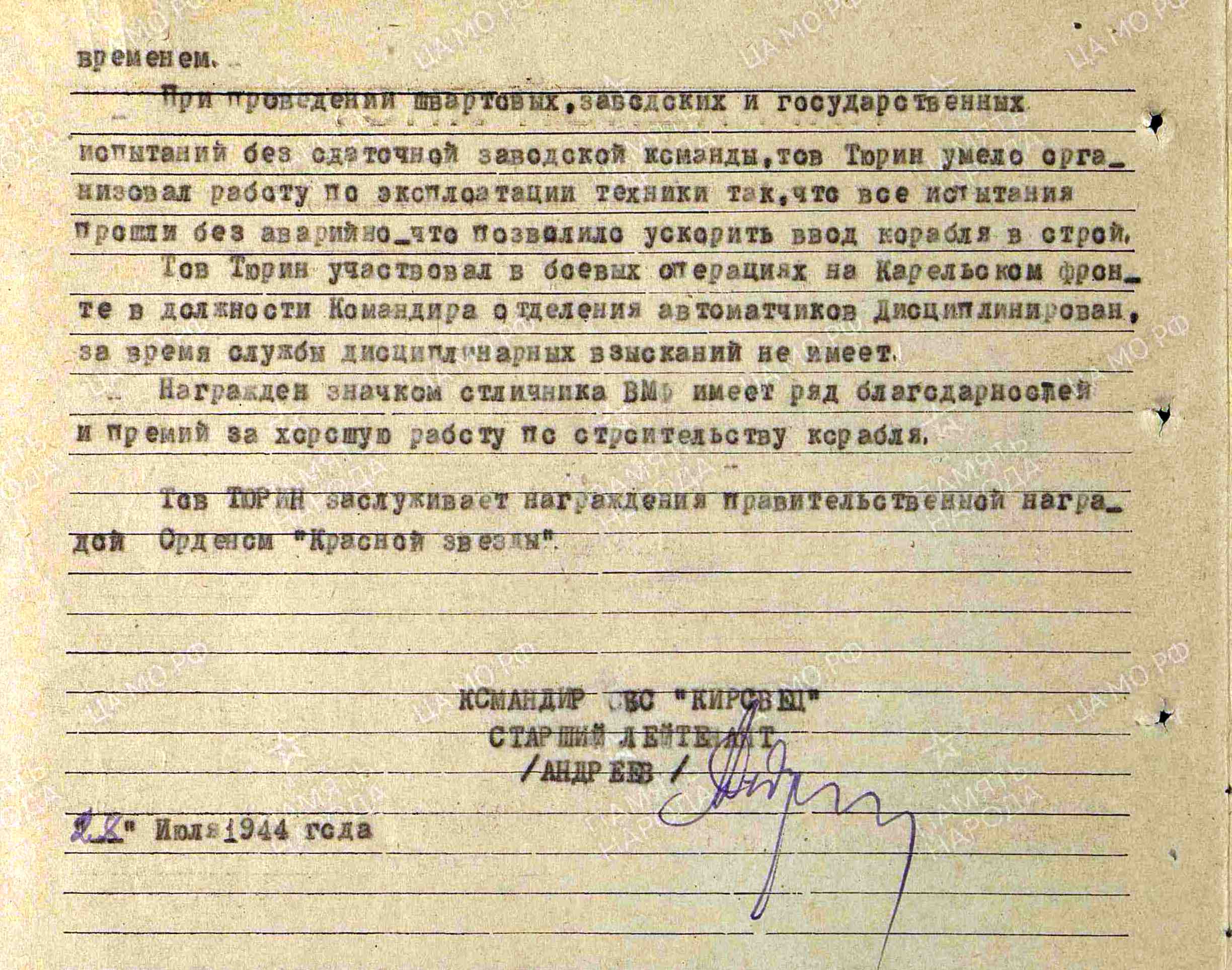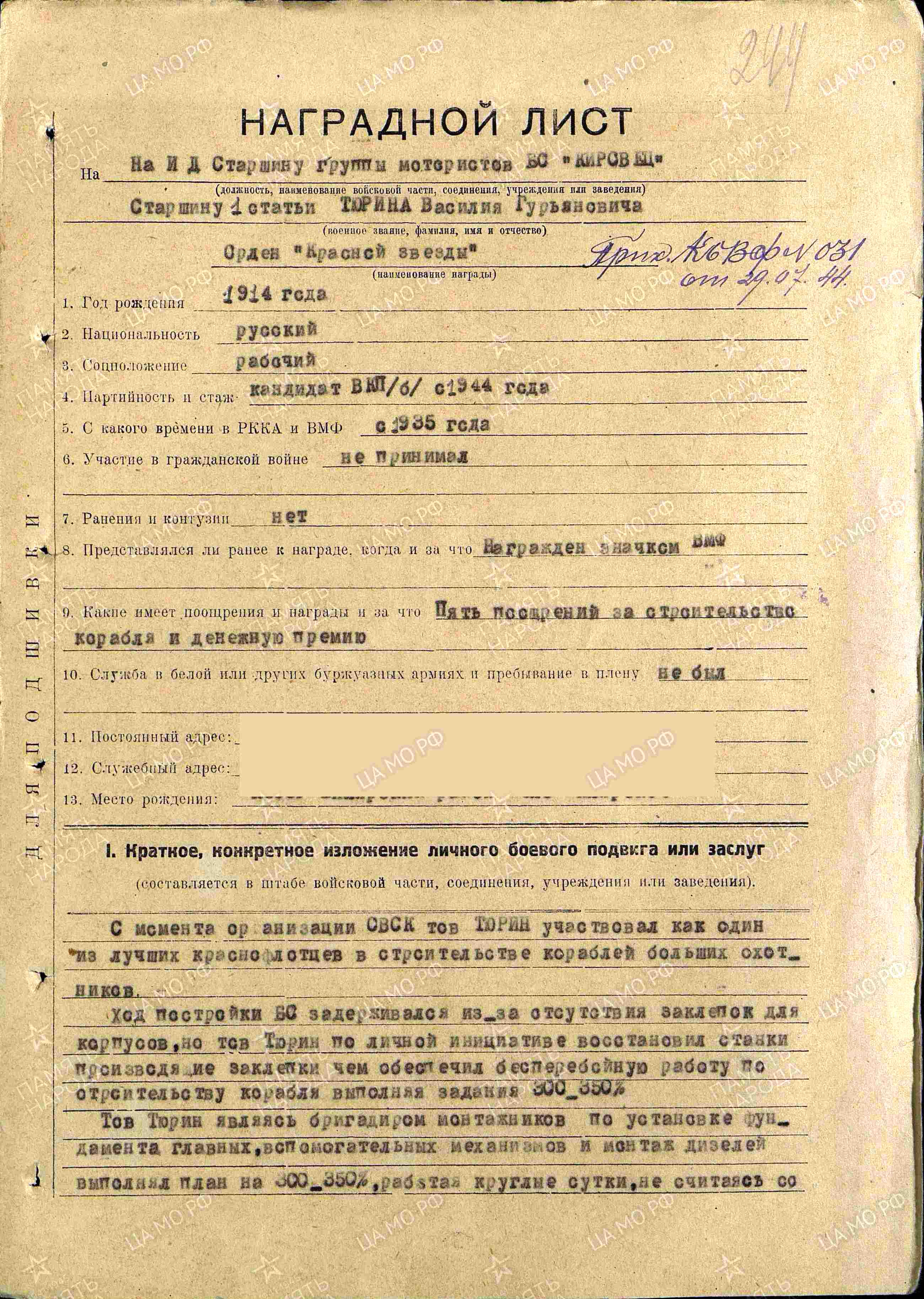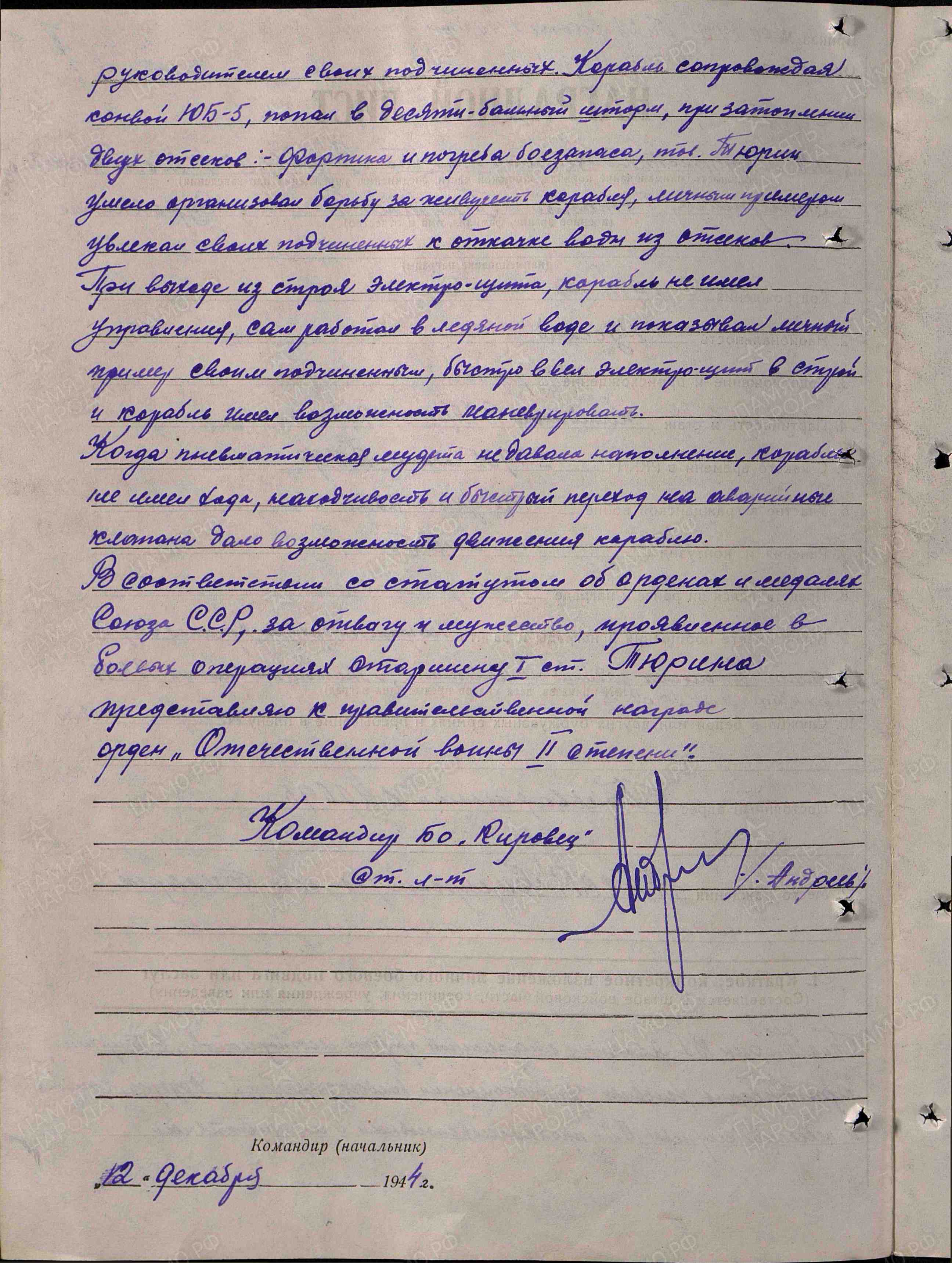 ТЮРИН Василий Гурьянович, 1914, с. Билярск. С 1935 по 1938 проходил срочную службу на флоте. Мобилизован Билярским РВК 21 янв. 1942. Краснофлотец, старшина 1 ст. Воевал в должности ком. отделения автоматчиков на Карельском фронте. Канд. ВКП(б). В 1944-1945 – моторист противолодочного корабля БО-141 (Большой Охотник) «Рулевой», старшина группы мотористов БО «Кировец» 1 дивизиона БО бригады «охотников» Охраны водного района Главной базы Северного флота. Награждён знаком «Отличник ВМФ», медалью «За оборону Советского Заполярья», двумя орденами Красной Звезды. Демобилизован 30 дек. 1945.
