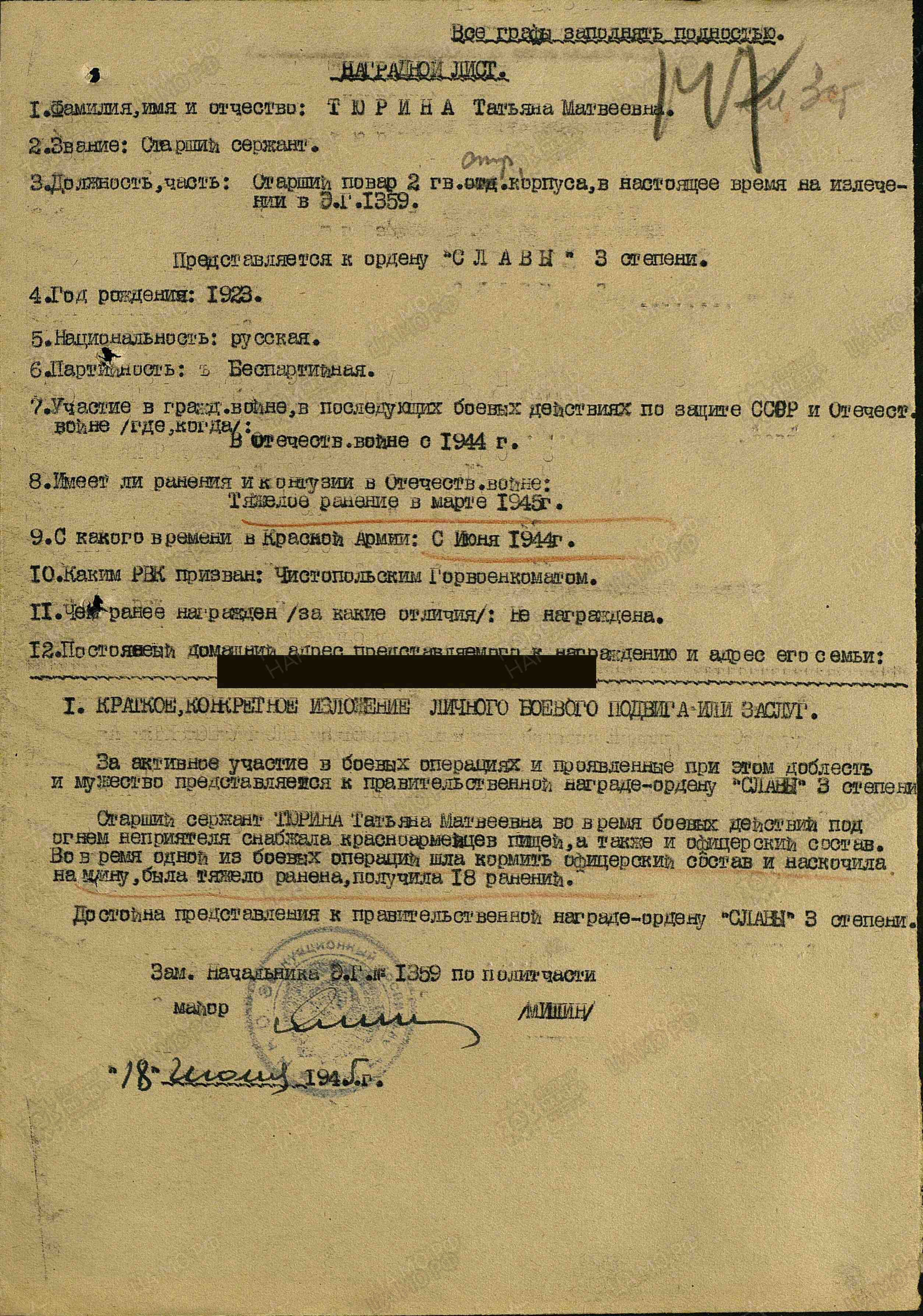 Татьяна Матвеевна родилась в 1923 г.р. В июне 1944 года была призвана в ряды Красной Армии Чистопольским РВК, служила в должности старшего повара 2 Гвардейского стрелкового корпуса.