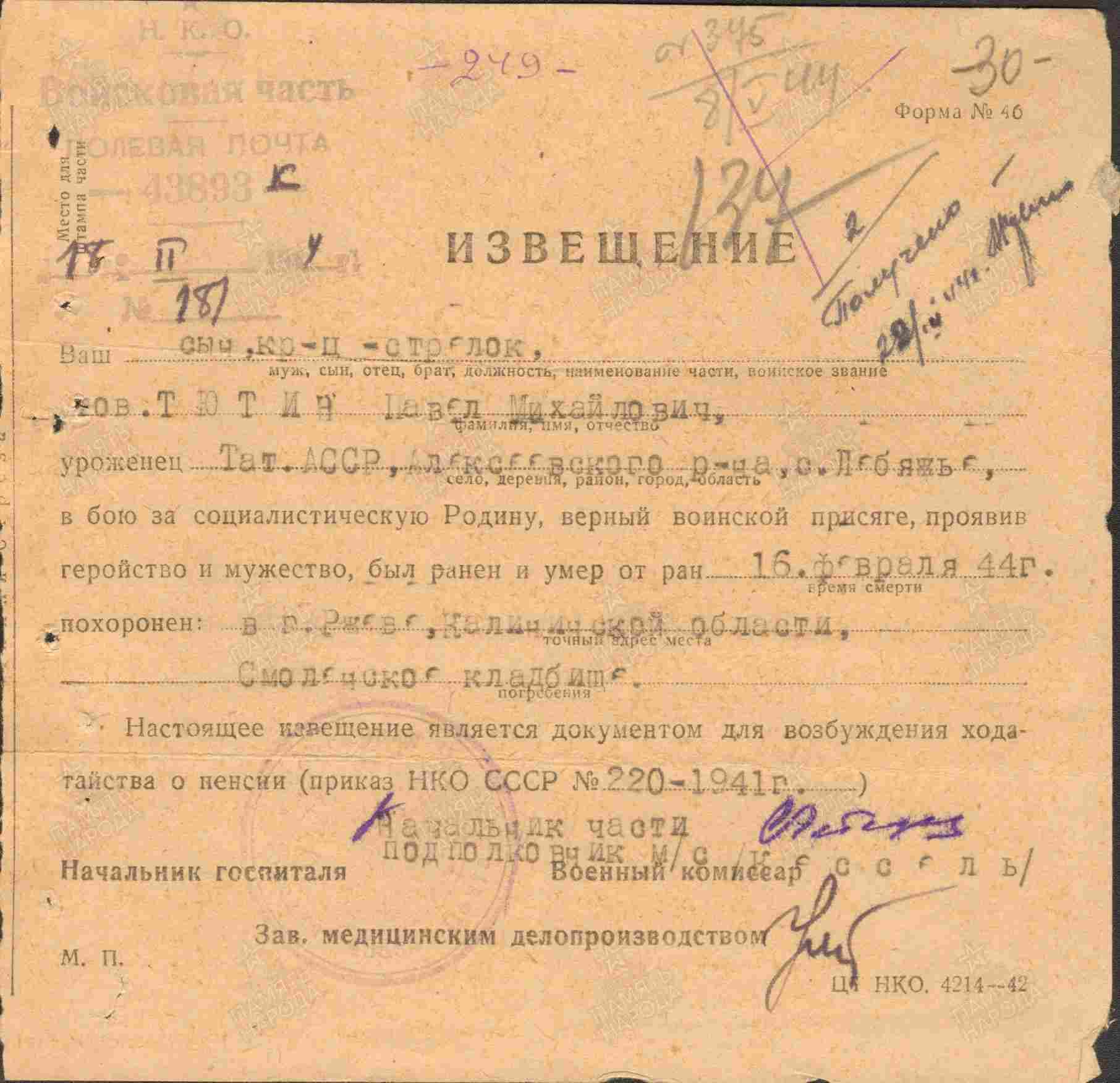 ТЮТИН Павел Михайлович, 1926, с. Лебяжье. Мобилизован в 1943 Алексеевским РВК. Гв. красноармеец, стрелок 53 гв. СП 18 гв. СД 16 гв. СК 11 гв. А 1 Прибалтийского фронта. Тяжело ранен в бою. 26 янв. 1944 поступил из 14 отд. МСБ в ЭГ 1025, г. Ржев, Калининская (Тверская) обл., с ранением правого бедра с повреждением кости и отморожением обеих ступней. Умер 16 фев. 1944. Похоронен на Смоленском кл-ще г. Ржев.