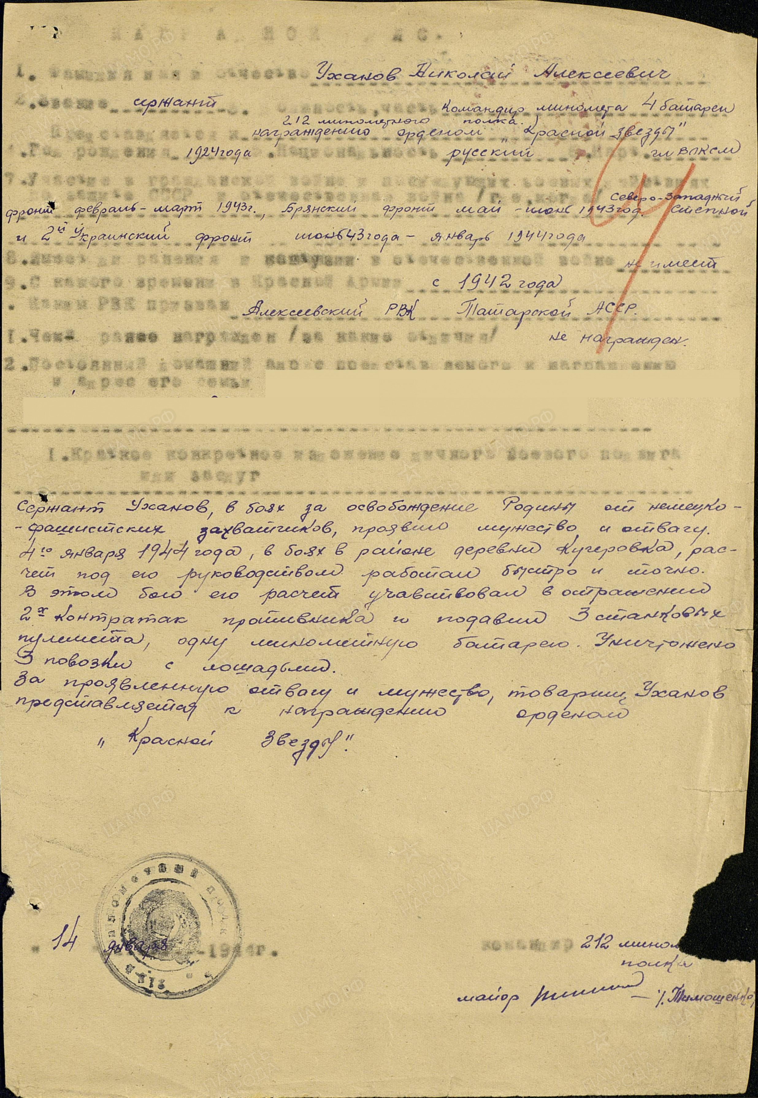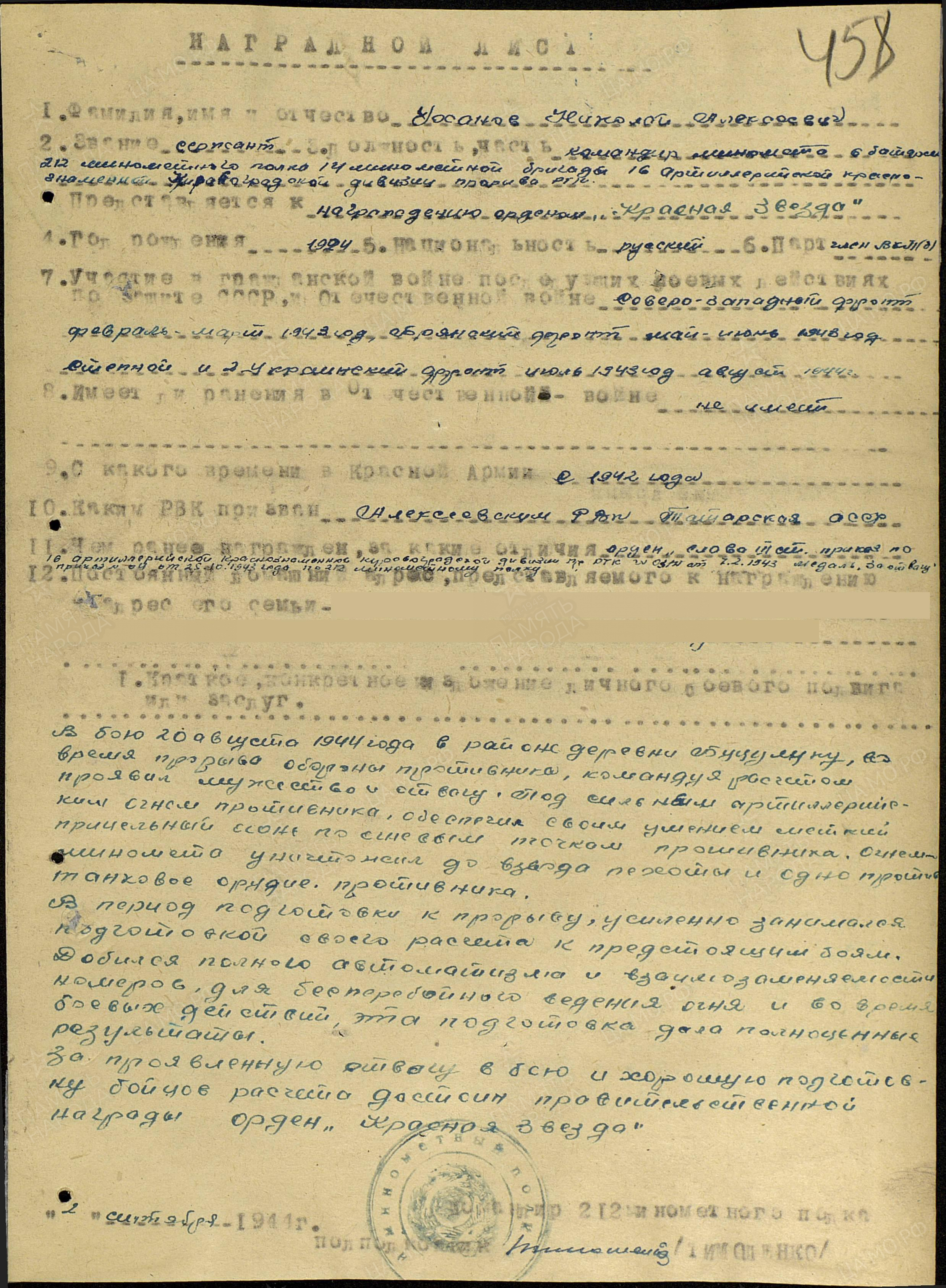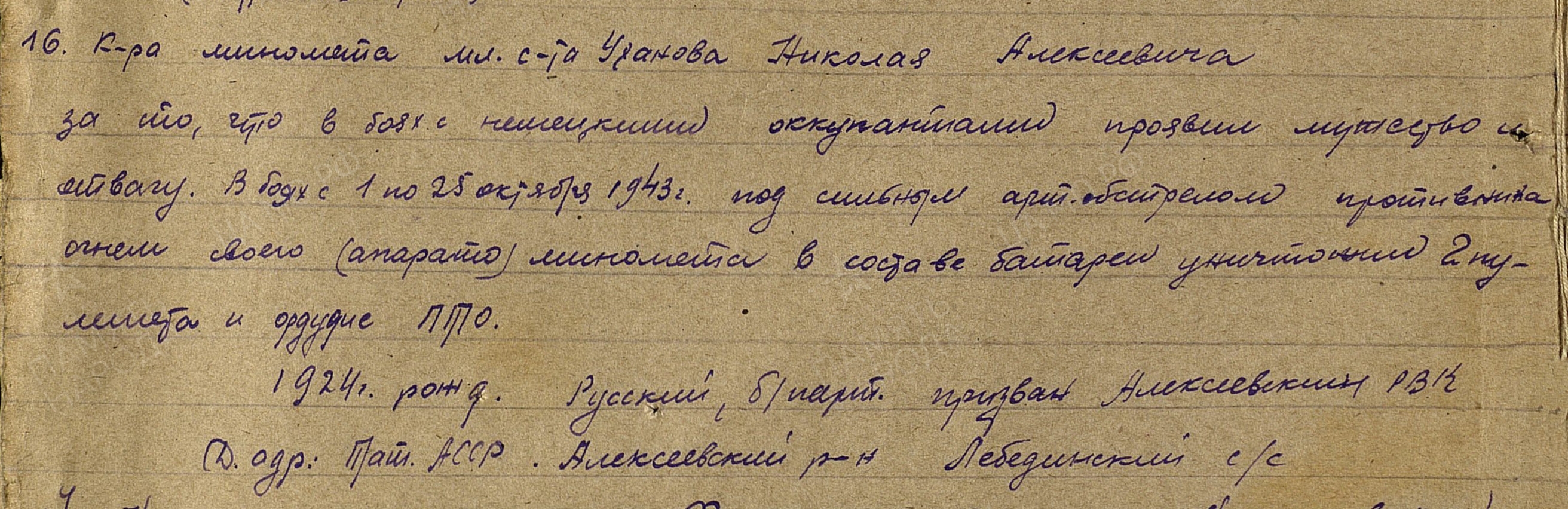 УХАНОВ Николай Алексеевич, 1924, д. Бутлеровка. Мобилизован Алексеевским РВК в авг. 1942. Воевал на СЗФ, БрянФ, 2 УкрФ. Ст. сержант, ком. миномёта 212 МинП 14 МинБр 16 АД пр РГК. Расчёт под его командованием в течение 1943-1944 уничтожил два пулемёта, два ПТО, отбил контратаку танков, подавил три станковых пулемёта, одну миномётную батарею, три повозки с лошадьми, до взвода вражеской пехоты. Награждён медалями «За боевые заслуги», «За отвагу», орденами Славы 3 ст., Красной Звезды.
