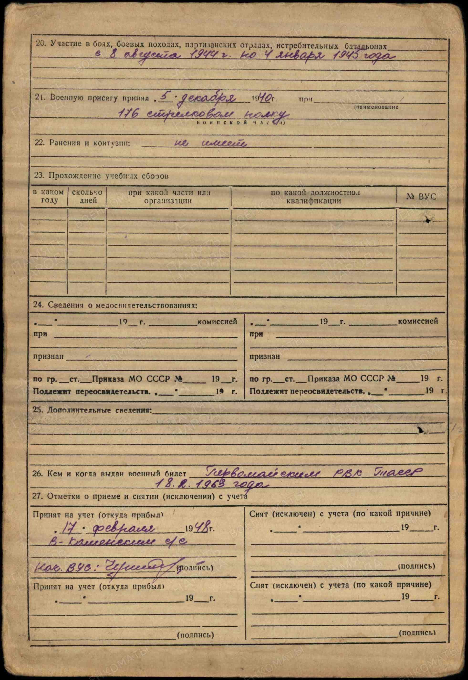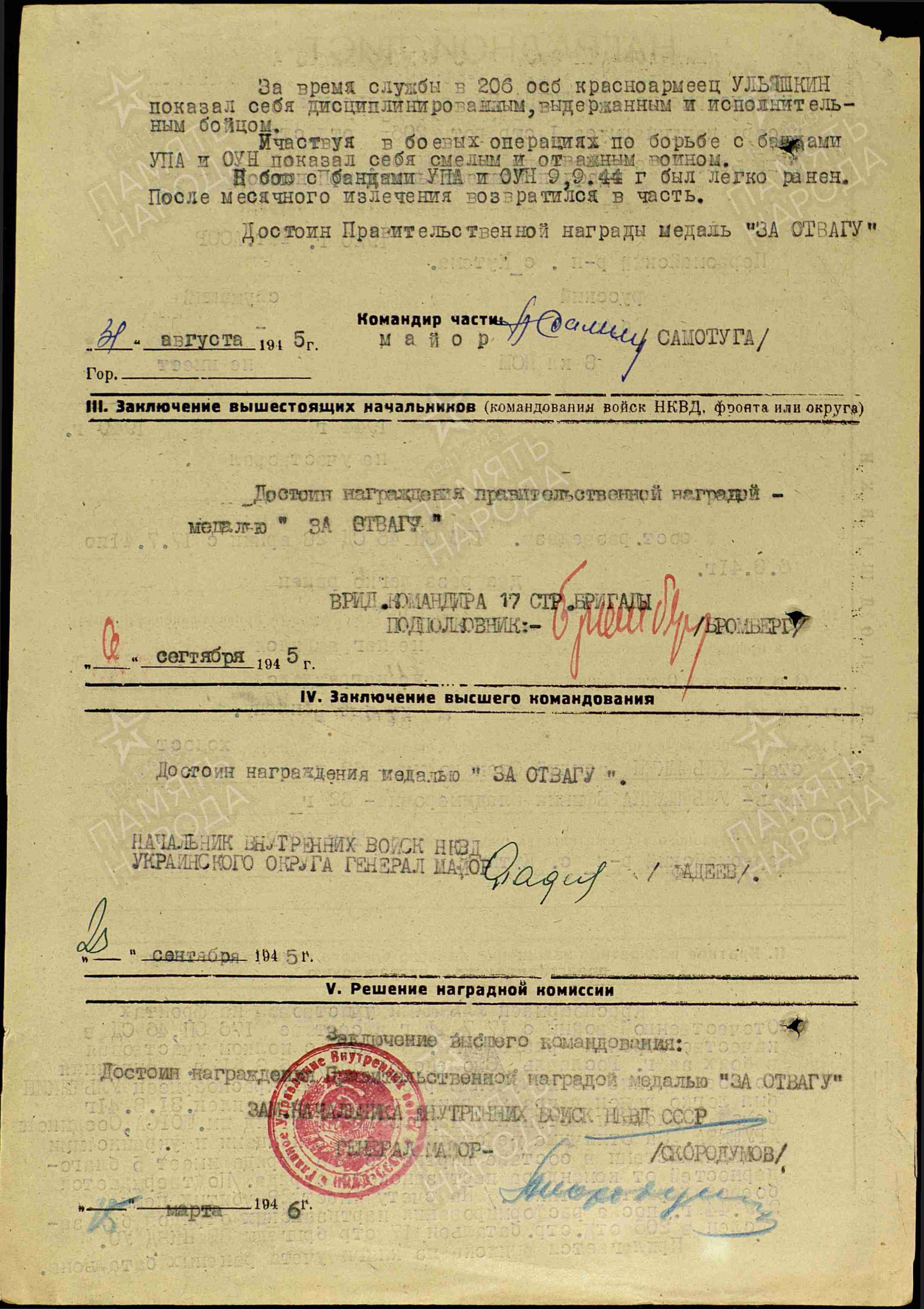 28.08.1944 г. Соединился с войсками в составе отряда. Был направлен в войска МВД по борьбе с бандеровцами до февраля 1945 г.( 206 отдельный стрелковый батальон внутренних войск