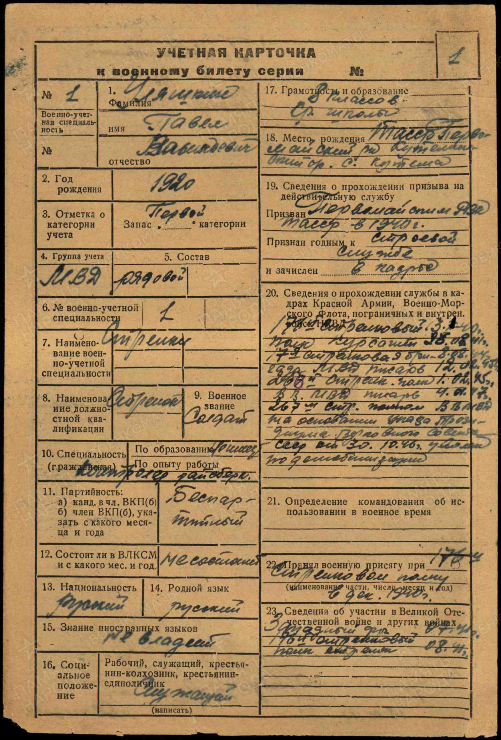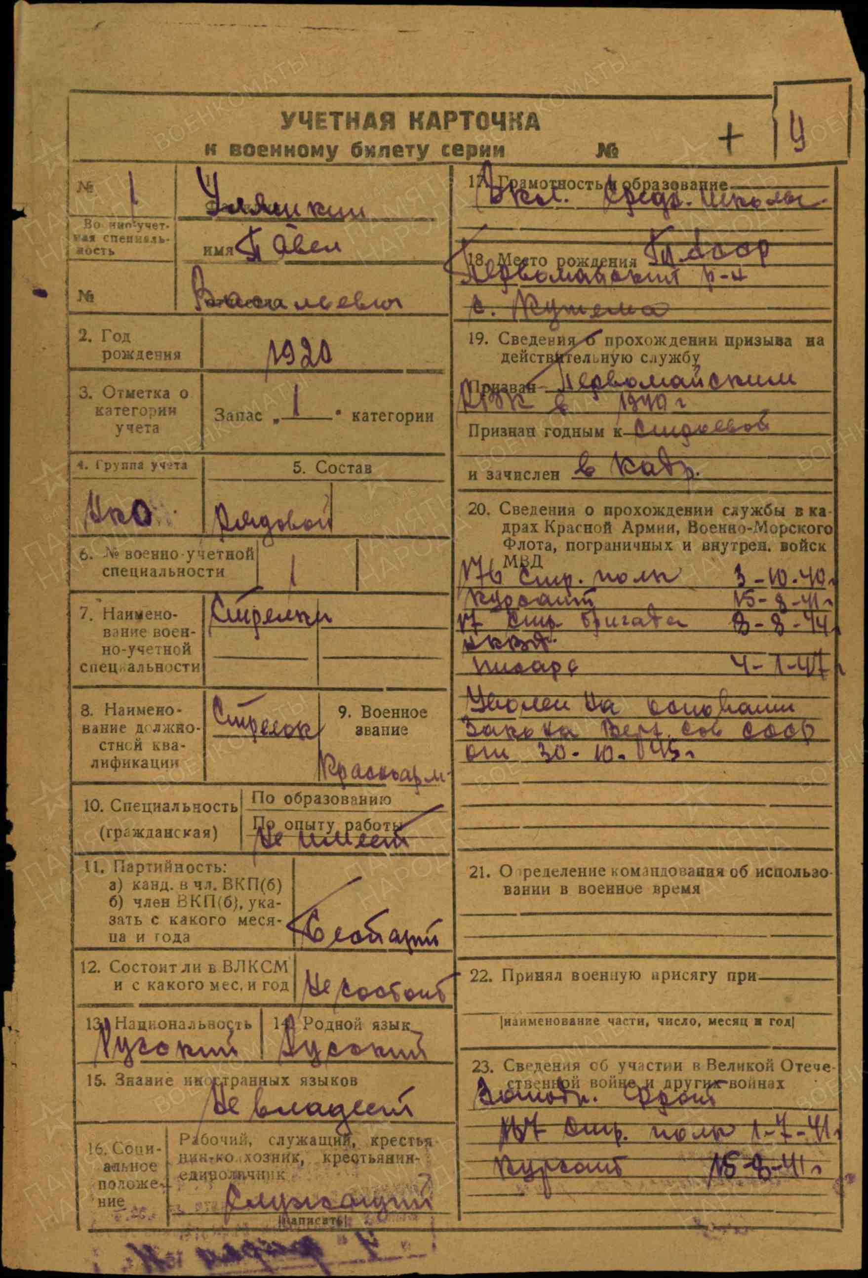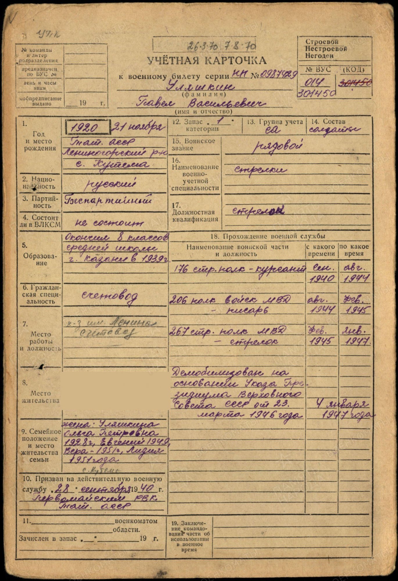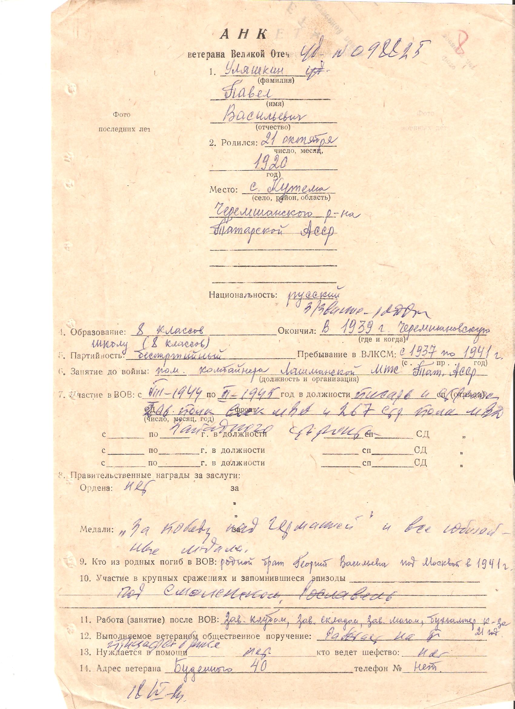 Призван 02.10.1940г. Первомайским РВК, ТАССР.