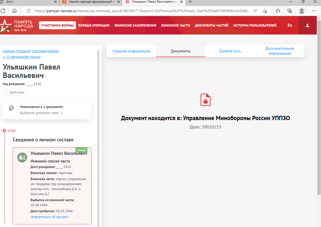 10.121.1941 г8ода перешел границу в район г. Ковеля. До 8.03.1944г находился на Украине в окупированной територии, вступил в ппартизпнский отрядЖанкина им. Щорса.