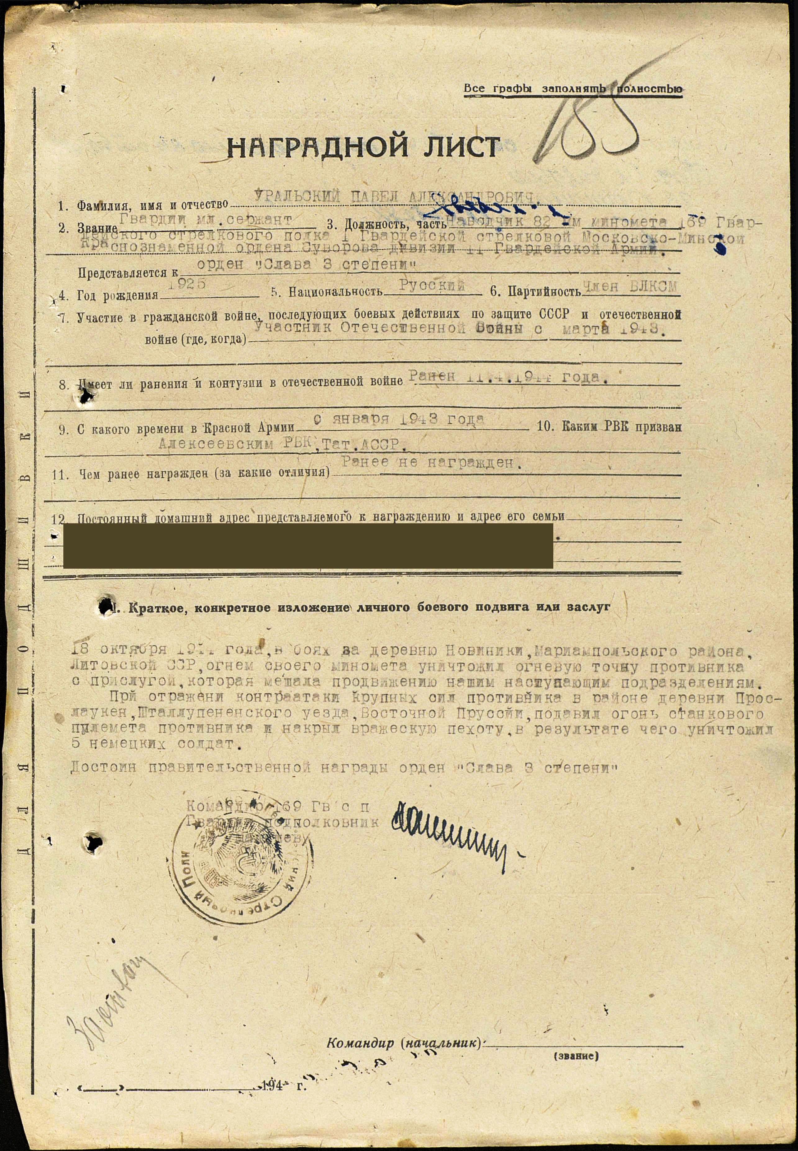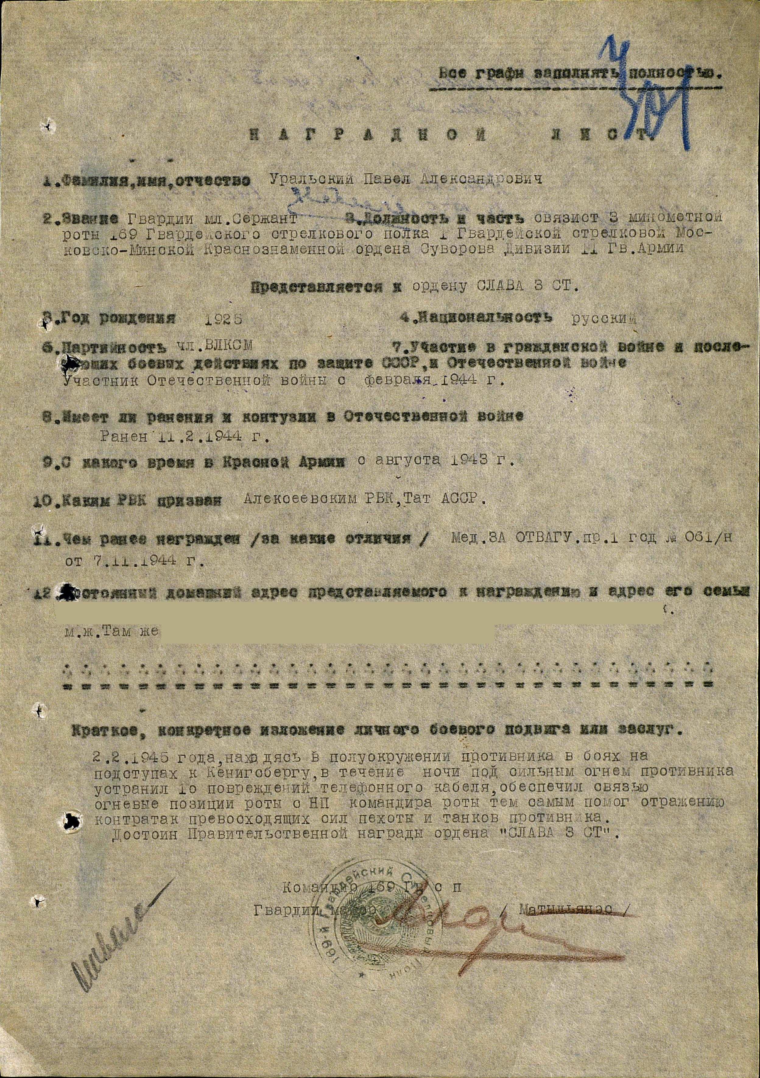 УРАЛЬСКИЙ Павел Александрович, 1925, с. Куркуль. Мобилизован Алексеевским РВК в 1943. Гв. сержант, связист, командир 82мм миномётного расчёта 169 гв. стрелк. полка 1 гв. стр. дивизии 11 гв. А. Воевал в Белоруссии, Прибалтике, под Кёнигсбергом. В апреле 1944 был ранен. Награждён мелдалями "За отвагу" - дважды (второй медалью награждён вместо ордена Славы 3 ст.), "За победу над Германией". После войны работал водителем, скотником в совхозе "Красный Восток". Скончался в 1984, похоронен в с. Алексеевское.