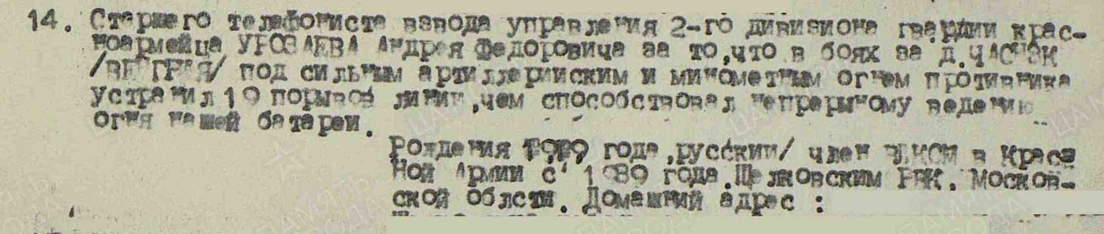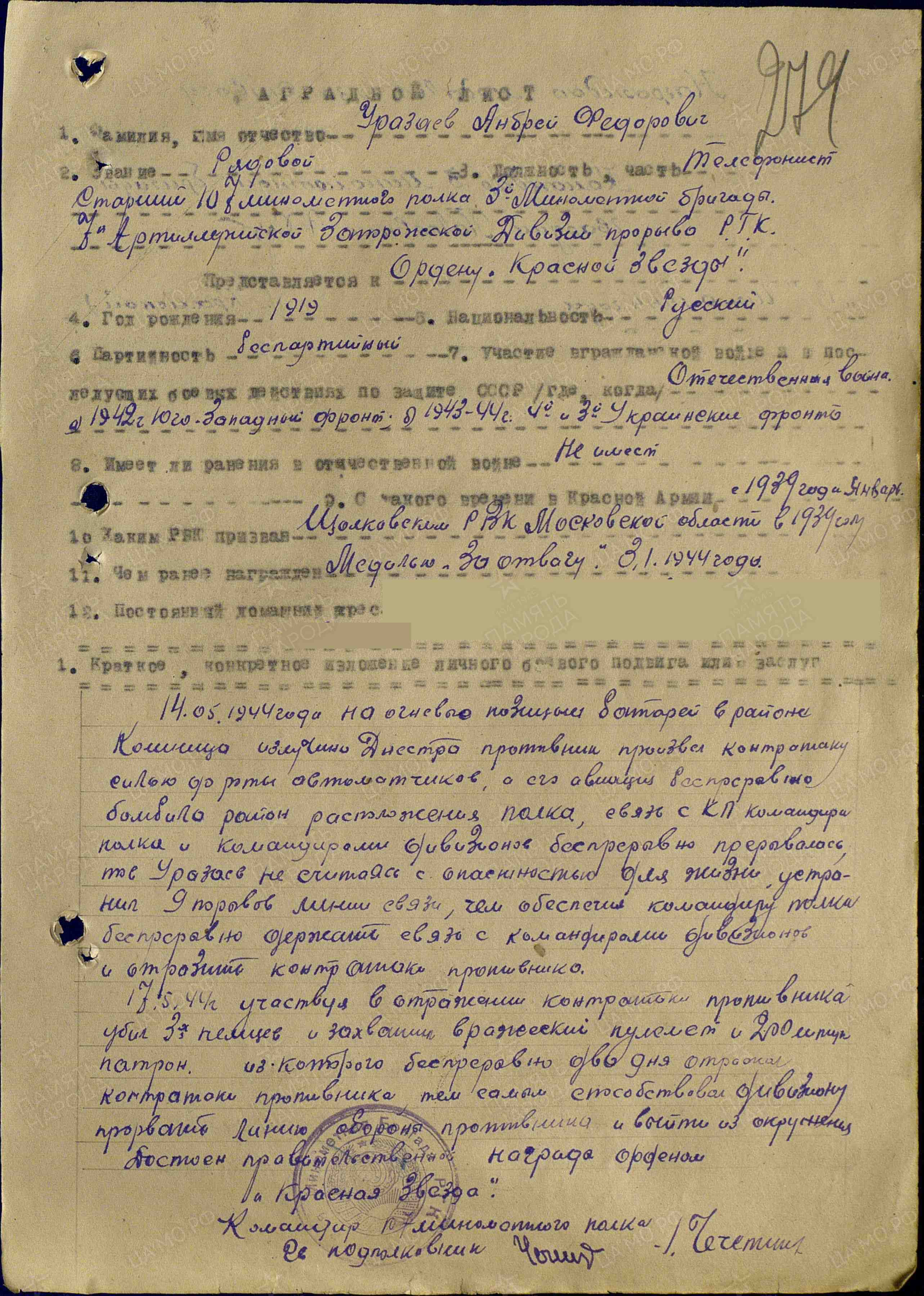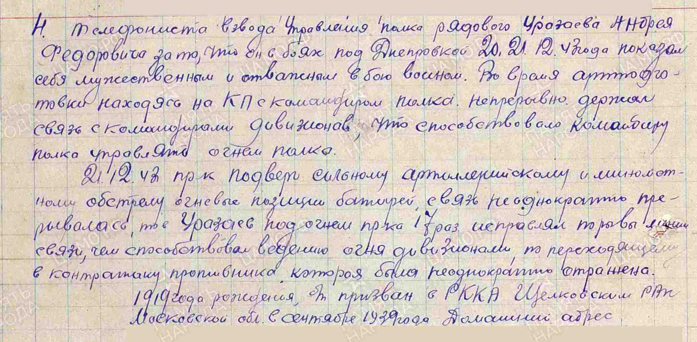 УРАЗАЕВ Андрей Фёдорович, 1919, с. Арбузов Баран. Призван в сент. 1939 Щёлковским РВК Московской обл. Член ВЛКСМ. На фронте с 1942. Воевал на Юго-Западном, 4, 2, 3 Украинском фронте. Красноармеец/ гв. красноармеец, телефонист взвода управления дивизиона 107 МинП 3 МинБр 7 АртД 5 ТА/ 1 гв. А/ 6 А, телефонист старший 535 гв. МинП 105 гв. СД 9 гв. А. Награждён тремя медалями «За отвагу», орденом Отечественной войны 2 ст. (1985).