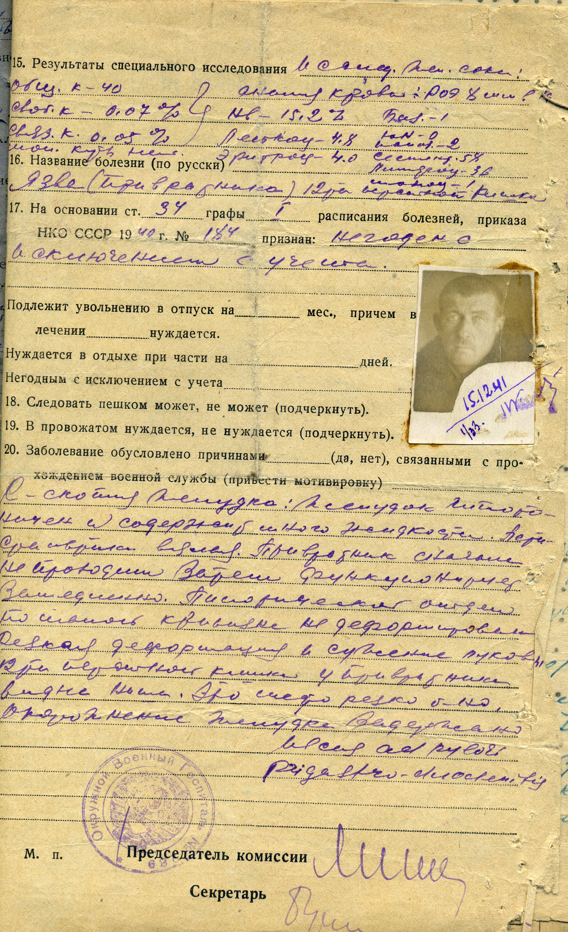 УСТИМОВ Василий Филиппович, 1902, с. Лягушкино. Мобилизован Билярским РВК в 1941 г. Красноармеец 257 МСБ. В октябре 1941 г. поступил в окружной военный госпиталь № 289 с сильными болями в животе и другими тяжёлыми симптомами. Установлена язва превратника желудка. 4 ноября 1941 г. признан негодным к строевой службе со снятием с воинского учёта.
