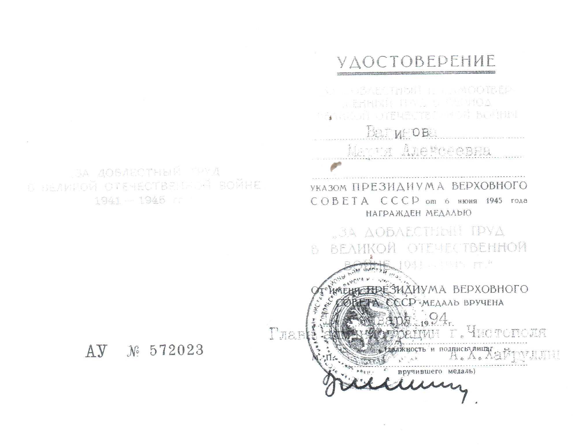 Родилась в 1926 г.р., в Рыбно-Слободский районе, с. Мельничный Починок. Жила и работала в с. Александровка Чистопольского района. Ветеран труда, награждена медалью "За доблестный труд в Великой Отечественной войне 1941-1945гг., юбилейными медалями.
