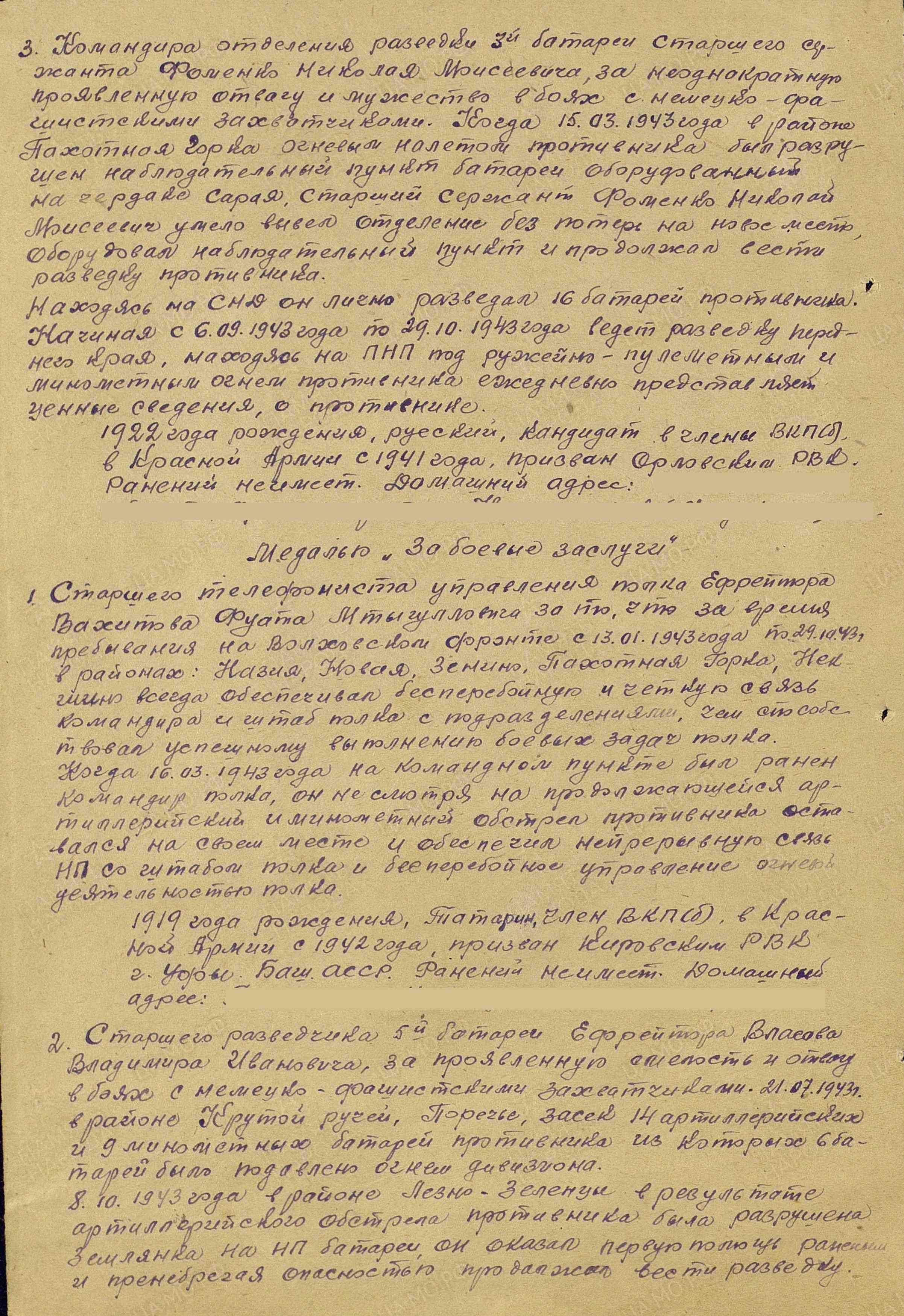 Фауш Мтыгумович Вахитов родился в 1919 г. в г.Чистополе, ТАССР. В 1942 г. призван в ряды Красной Армии Кировским районным военным комиссариатом г.Уфы Башкирской АССР. Служил в должности старшего телефониста управления полка, в звании ефрейтора. Был награжден медалью «За боевые заслуги» (29.10.1943).