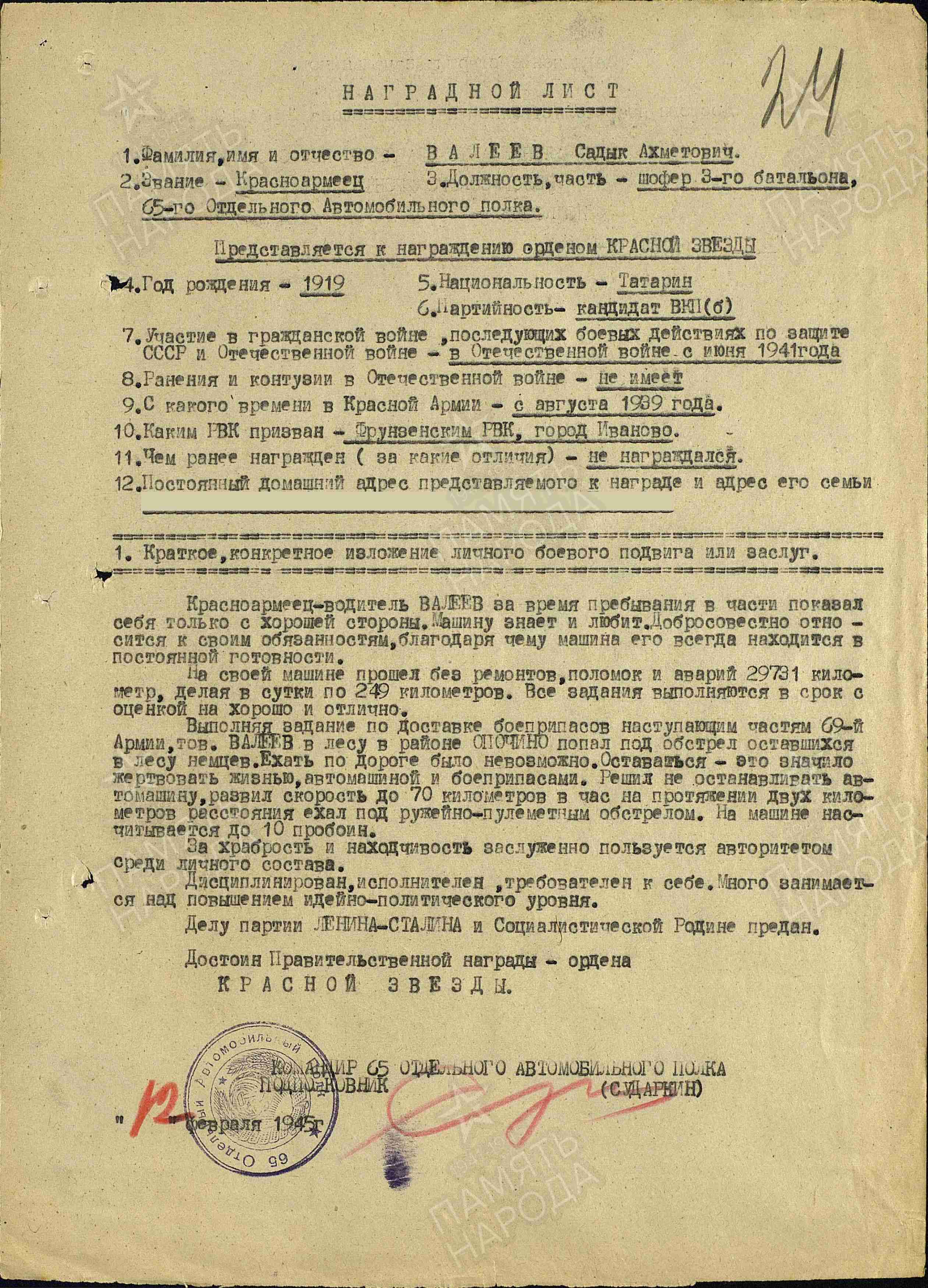 ВАЛЕЕВ Садык Ахметович, 1919, с. Сухие Курнали. Призван в авг. 1939 Фрунзенским РВК г. Иваново. Участник войны с 1941. Красноармеец, шофёр 65 отд. автомобильного полка 18 автотранспортной бригады в составе 69 А Воронежского, Степного, 1 Белорусского фронта. Награждён медалью «За взятие Берлина», Красной Звезды, Отечественной войны 2 ст. (1985).