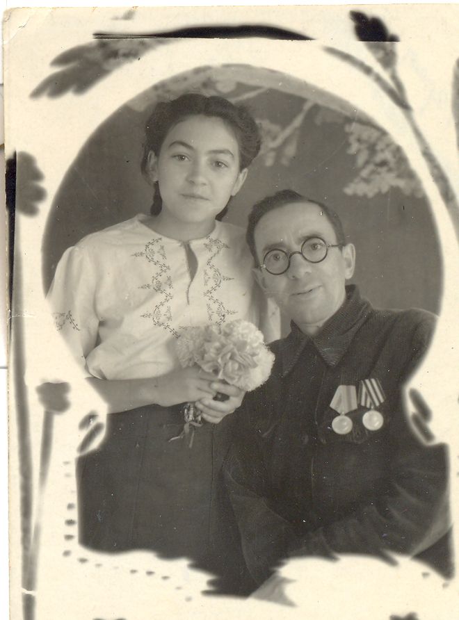 На обратном пути из школы около фотографии, расположенной у входа на рынок, я увидела папу. Как он смог прийти? Он был при медалях за боевые заслуги. Мы с ним сфотографировались на память об этом дне.