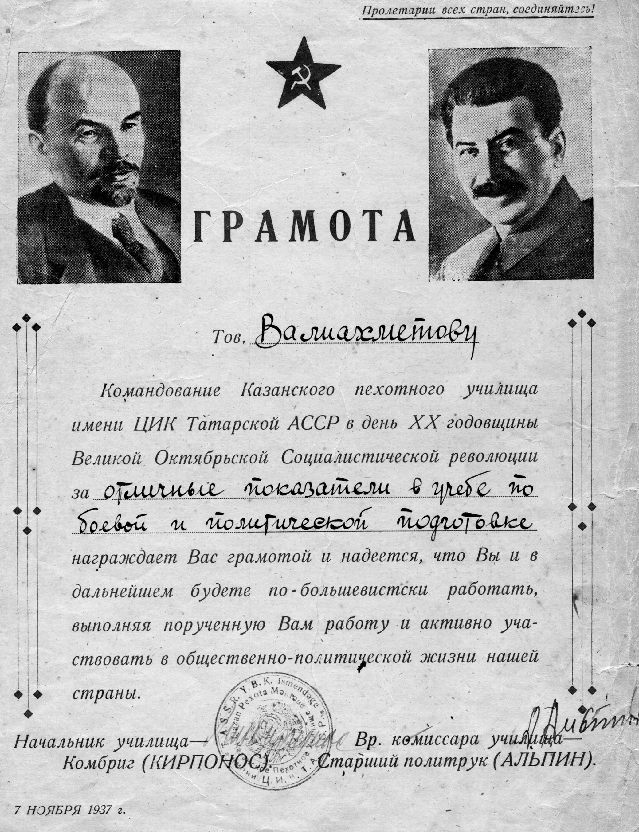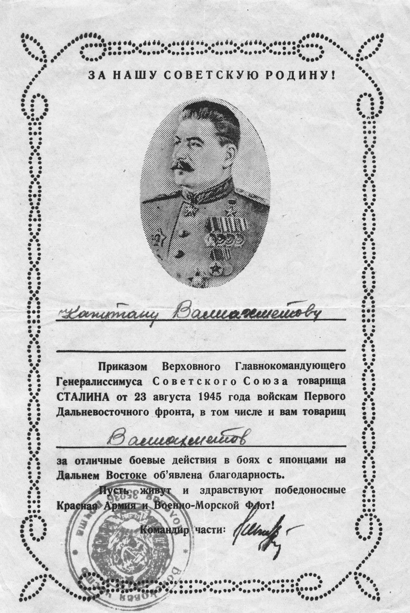 Как и многим воинам ДВФ Валиахметову Ф.З объявлена благодарность от Верховного Главнокомандующего