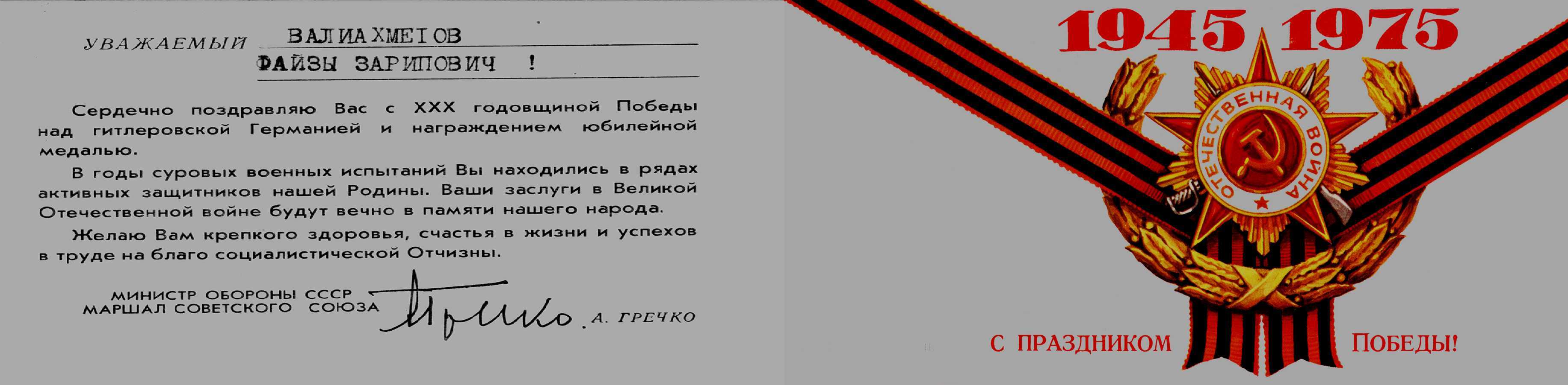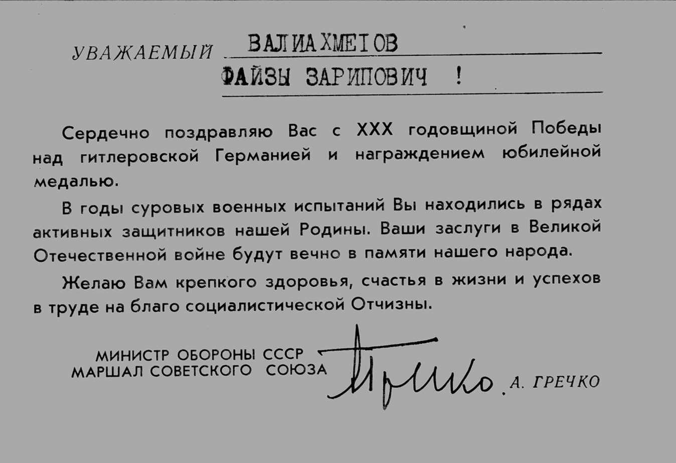 Учитывая вклад воинов Дальневосточного фронта в разгром фашистской Германии, многие воины этого фронта, в том числе и Валиахметов Ф.З. награждены медалью «За победу над Германией»