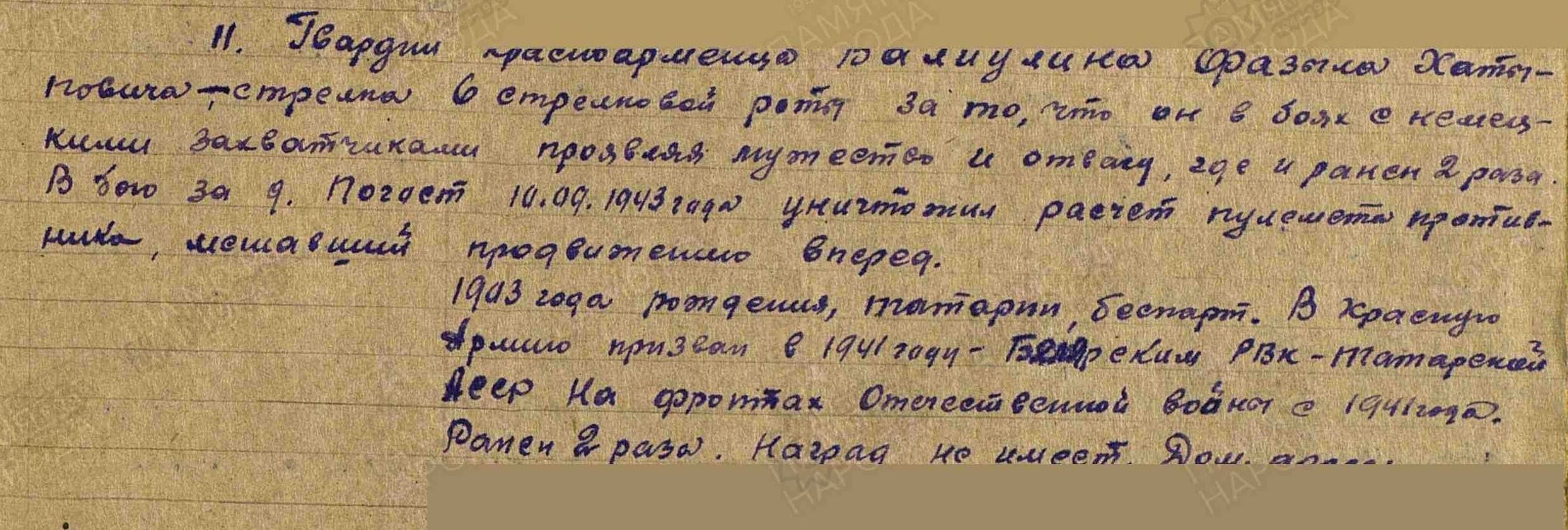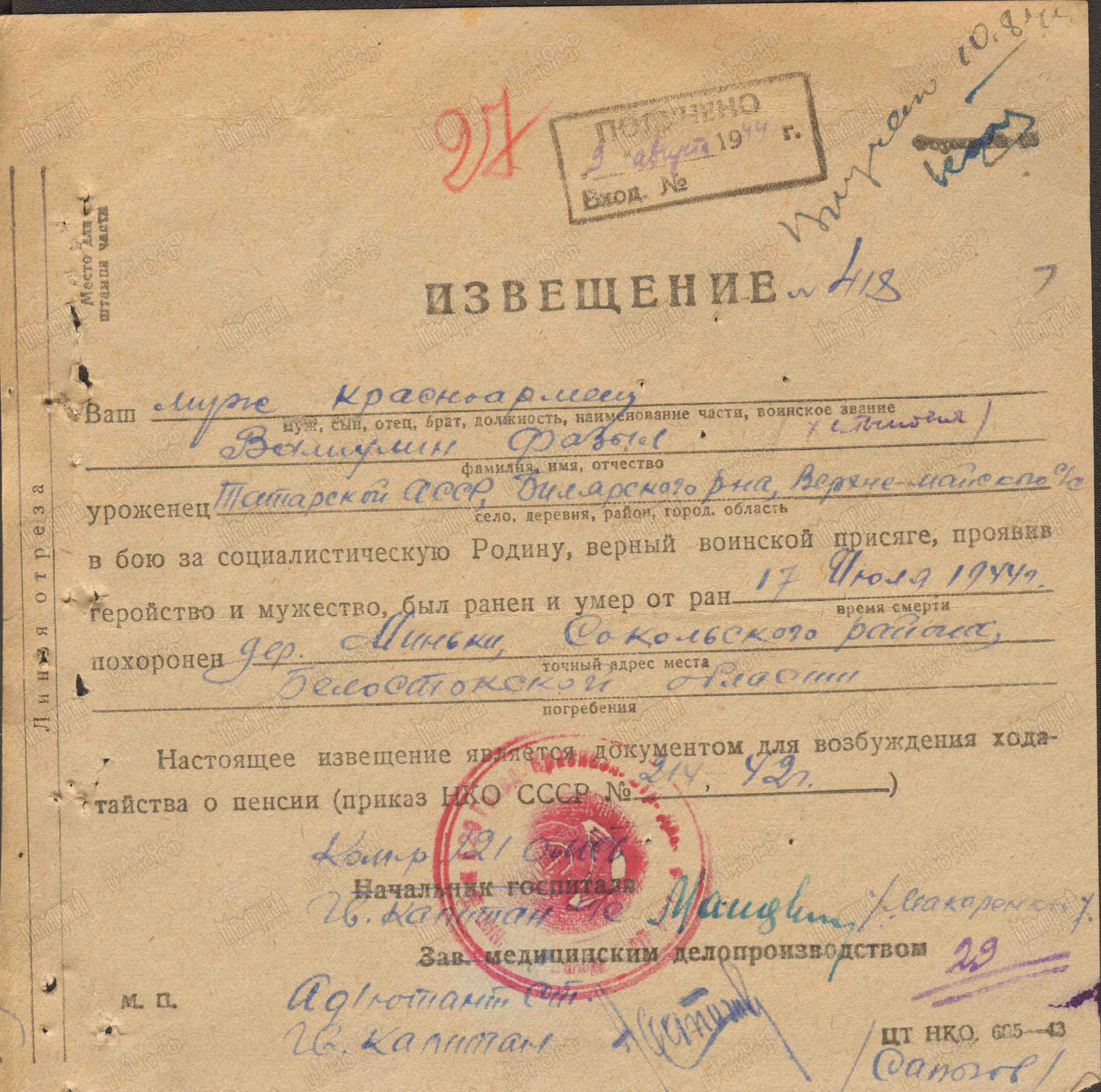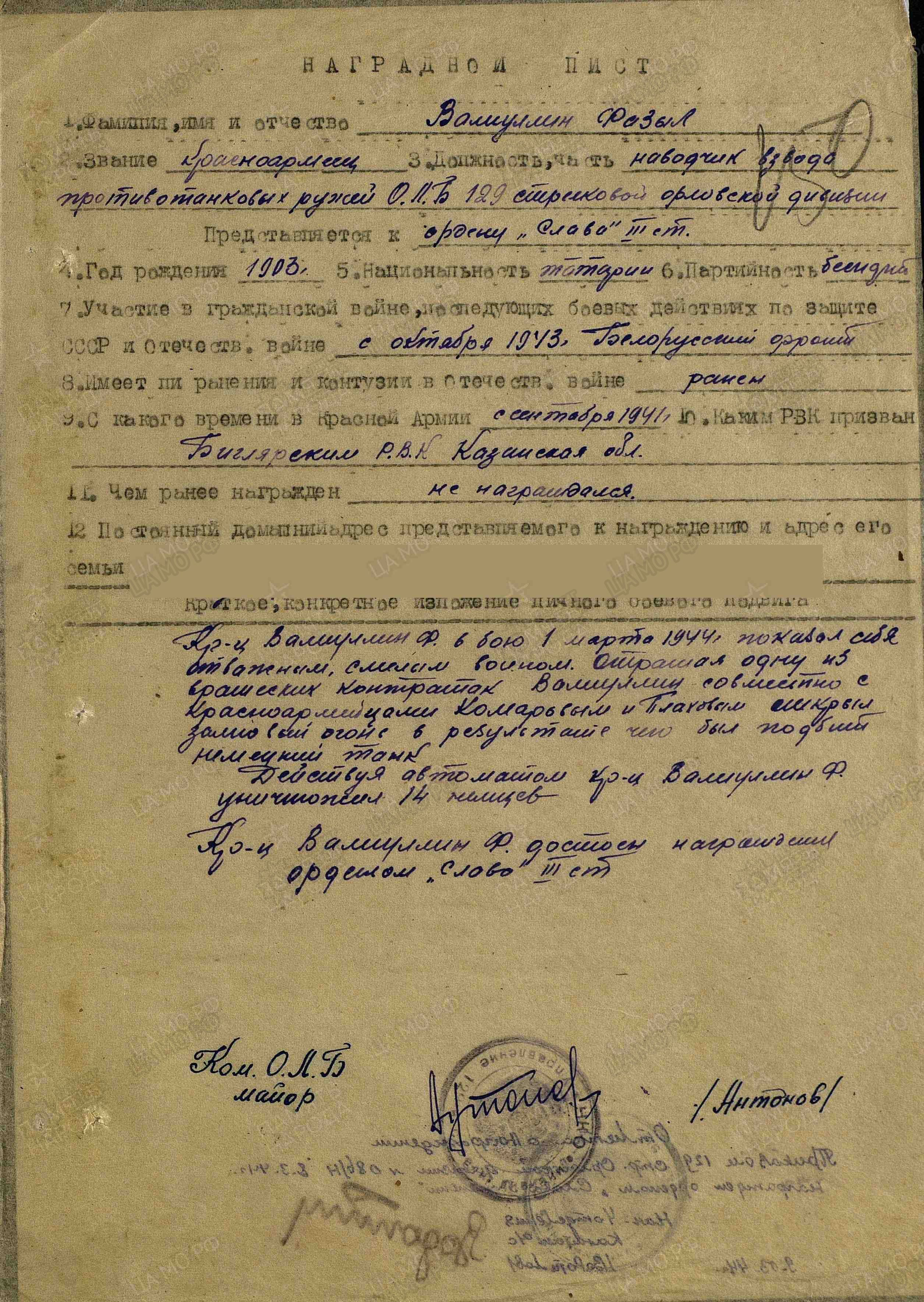 ВАЛИУЛЛИН Фазыл Хатыпович, 1903, с. Верхняя Татарская Майна. Мобилизован в 1941 г. Билярским РВК. Воевал в составе 23 стрелковой дивизии, красноармеец-миномётчик. В 1942 г. принимал участие в Сталинградской битве в составе 21 и 65 Армии Донского фронта. 1 февраля 1943 г. в бою за п. "Баррикады" был ранен осколком в правое плечо и грудную клетку. Первую помощь оказал лейтенант на поле боя. Далее МСБ 61, ЭГ 1047, ЭГ 3601. 8 июня 1943 г. был признан негодным на 6 месяцев. Мобилизован повторно. Воевал в составе 129 стр. дивизии 3 Армии 1 Белорусского фронта, стрелок роты ПТР. 1 марта 1944 г. в составе расчёта, отражая контратаку противника, подбил вражеский танк и из автомата уничтожил 14 немецких солдат. Представлен к ордену Славы 3 ст. (награда не вручена). После второго ранения воевал в составе 334 гв. СП 120 гв. СД. Отличился в бою за д. Погост, Белоруссия - уничтожил пулемётный расчёт противника. Награждён медалью "За боевые заслуги". 16 июля 1944 г. был ранен пулей в голову и скончался в МСБ 121. Похоронен в д. Миньки, Сокольский повят (округ), Белостокское воеводство, Польша.