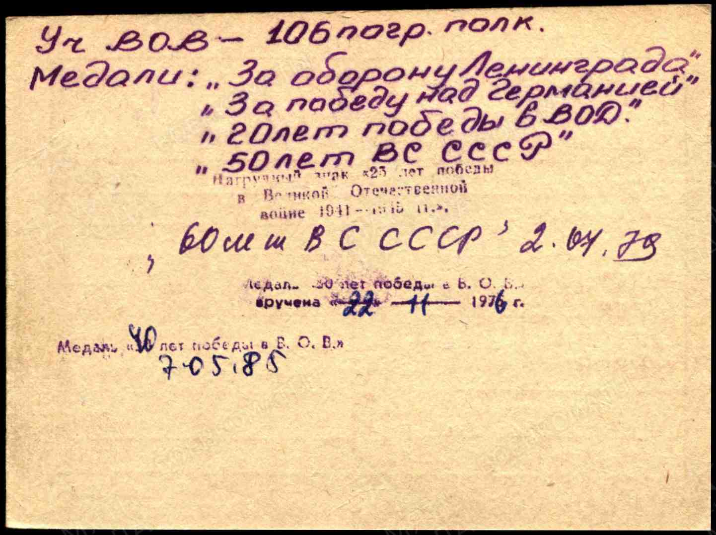 Призван: 10.07.1941г. Шугуровским РВК. Воинское звание: рядовой стрелок 107 пограничный отряд.106 стрелкового полка НКВД, Северный фронт. Участвовал в сражениях на Карельском фронте.