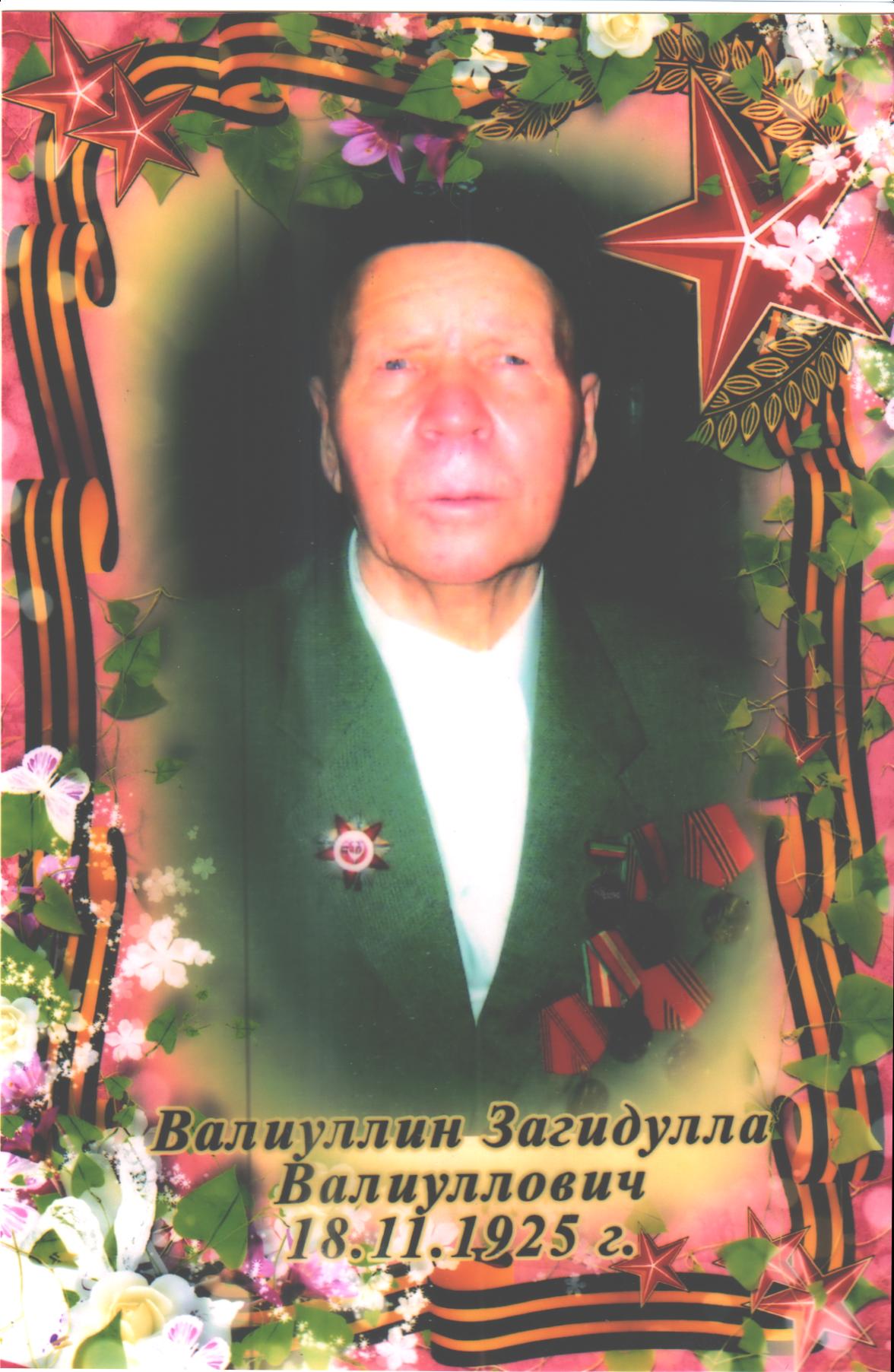 Валиуллин Загидулла Валиуллович родился 18 ноября 1925 года в крестьянской семье с. Урсаево. Прописан по адресу: с.Урсаево, ул. Советская д.49, проживает в г.Азнакаево, ул.Ахмадиева д.23 (у дочери).