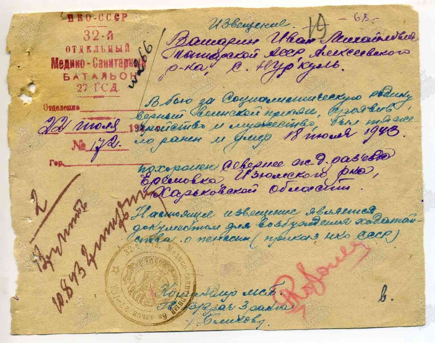 ВАШАРИН Иван Михайлович, 1924, с. Куркуль. Мобилизован 3 окт. 1942 Алексеевским РВК. Член ВЛКСМ. Красноармеец, курсант отд. учеб. батальона 27 гв. СД 8 гв. А Юго-Западного фронта. Умер от ран 18 июля 1943 в 32 отд. МСБ, похоронен у ж\д разъезда Ерёмовка, Изюмский р-н, Харьковская обл., УкрССР.