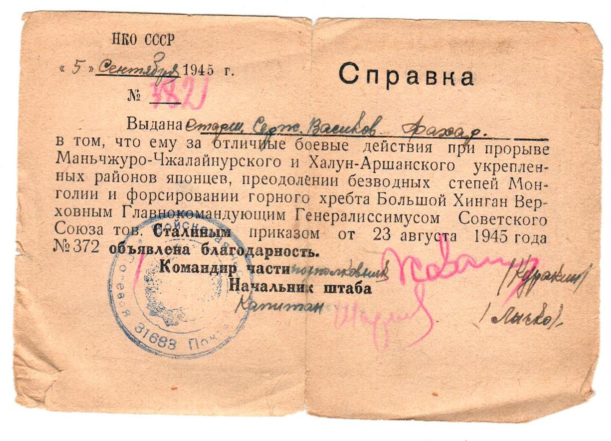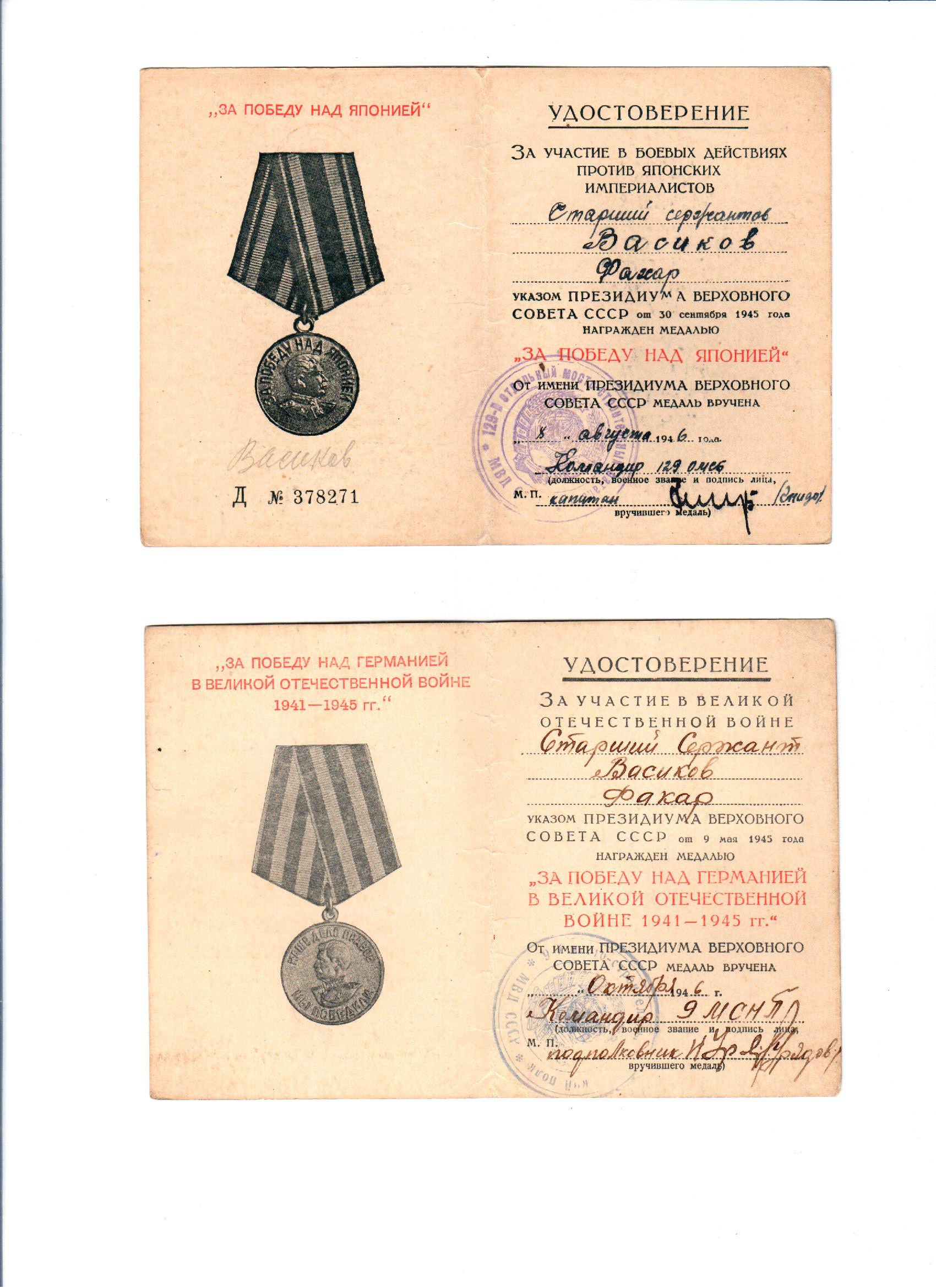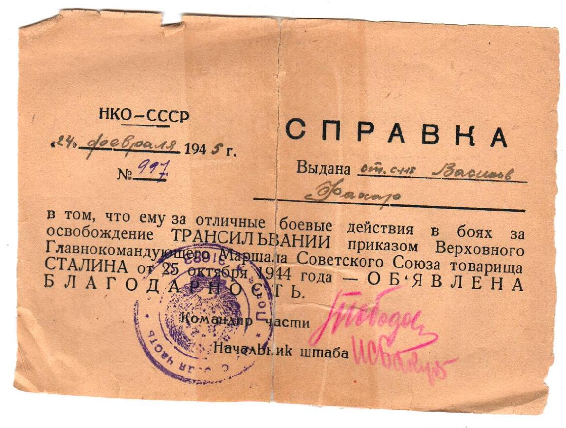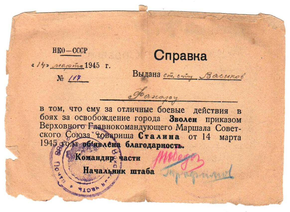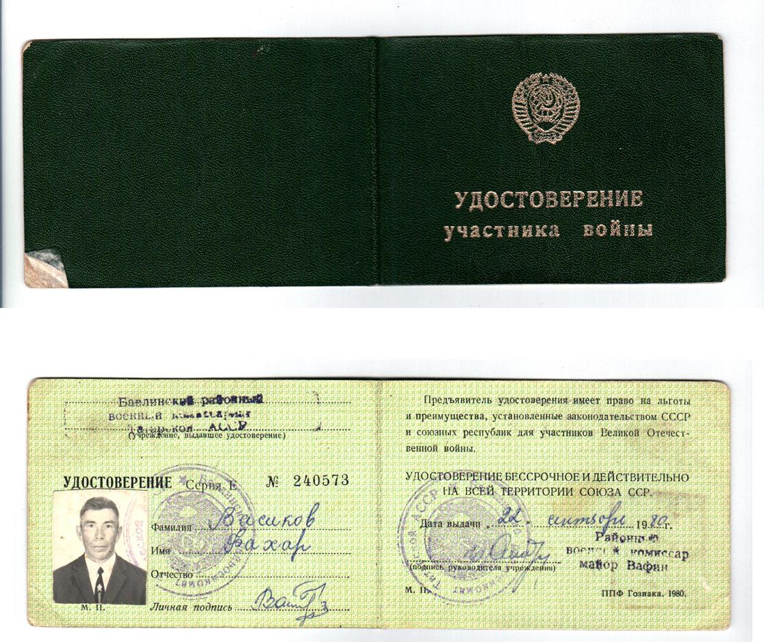 Васиков Фахар (Муфахар) Васикович родился 10 января 1921 года в д.Новые Шалты Бавлинского района Татарской АССР. Окончил 7 классов, работал трактористом в Свердловской области г.Нижний Тагил, отсюда же и был призван в ряды Красной Армии 15.11.1941 года, где дослужился от младшего сержанта до старшины разведроты. За освобождение г.Зволен, г.Трансильвании, г.Брио, за отличные боевые действия при прорыве Маньчжуро-Чжалайнорского и Халун-Аршанского укрепленных районов японцев, преодоление безводных степей Монголии и форсирования горного хребта Большой Хинган Верховным Главнокомандующим Генералиссимусом Советского Союза тов. Сталиным была объявлена благодарность.