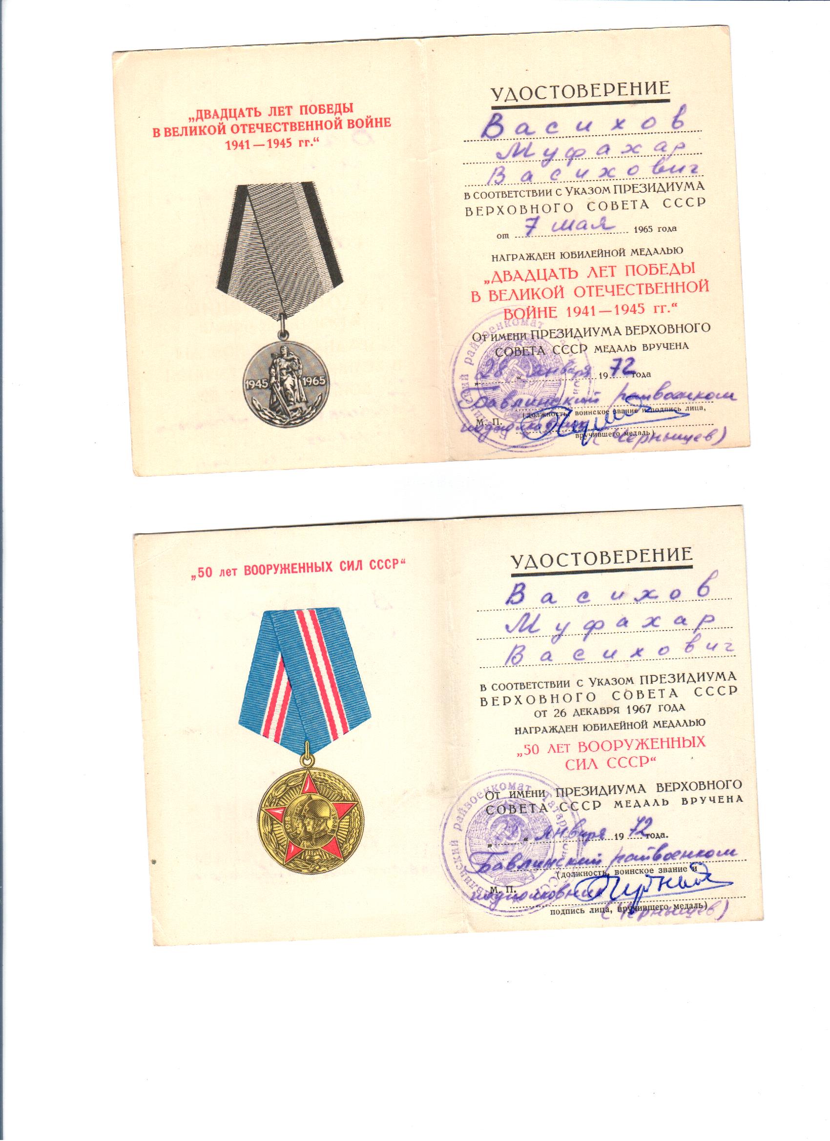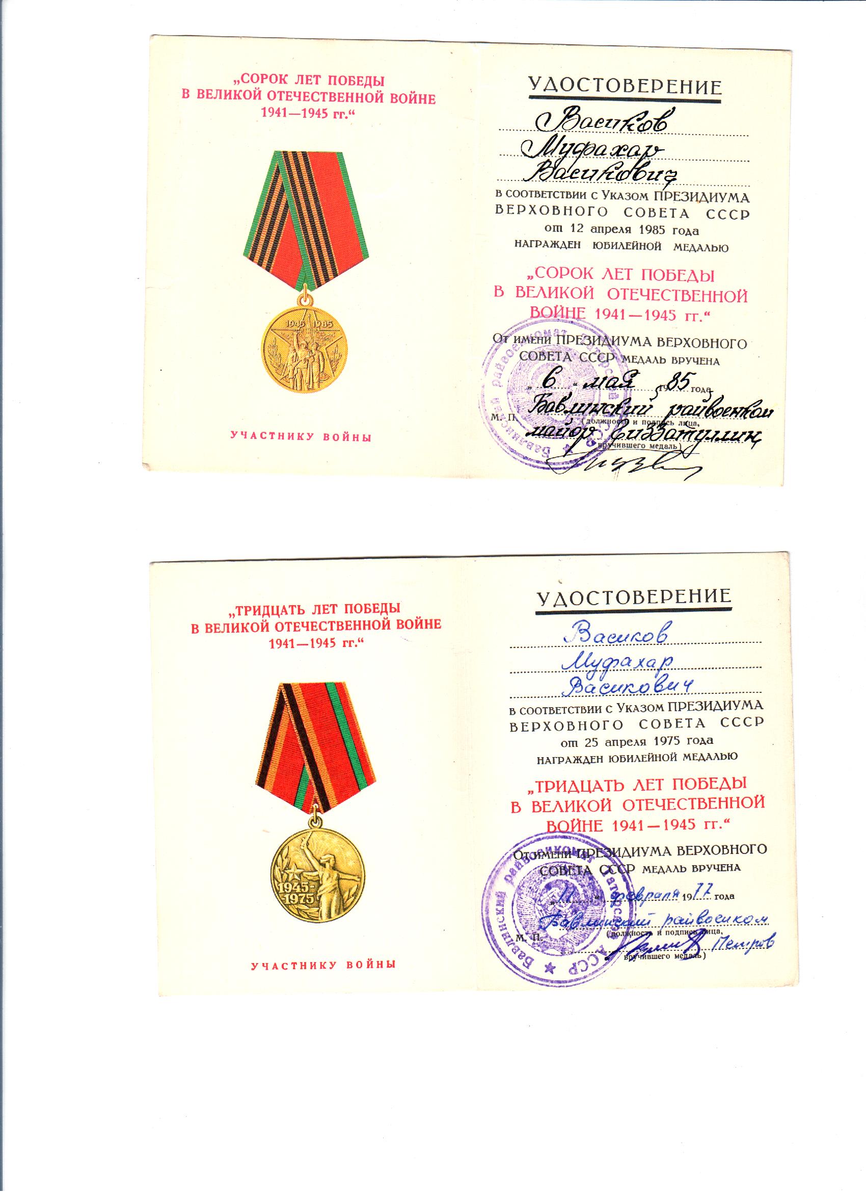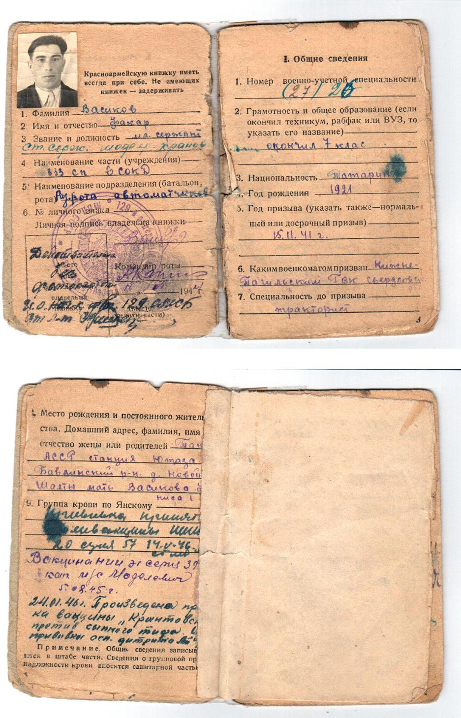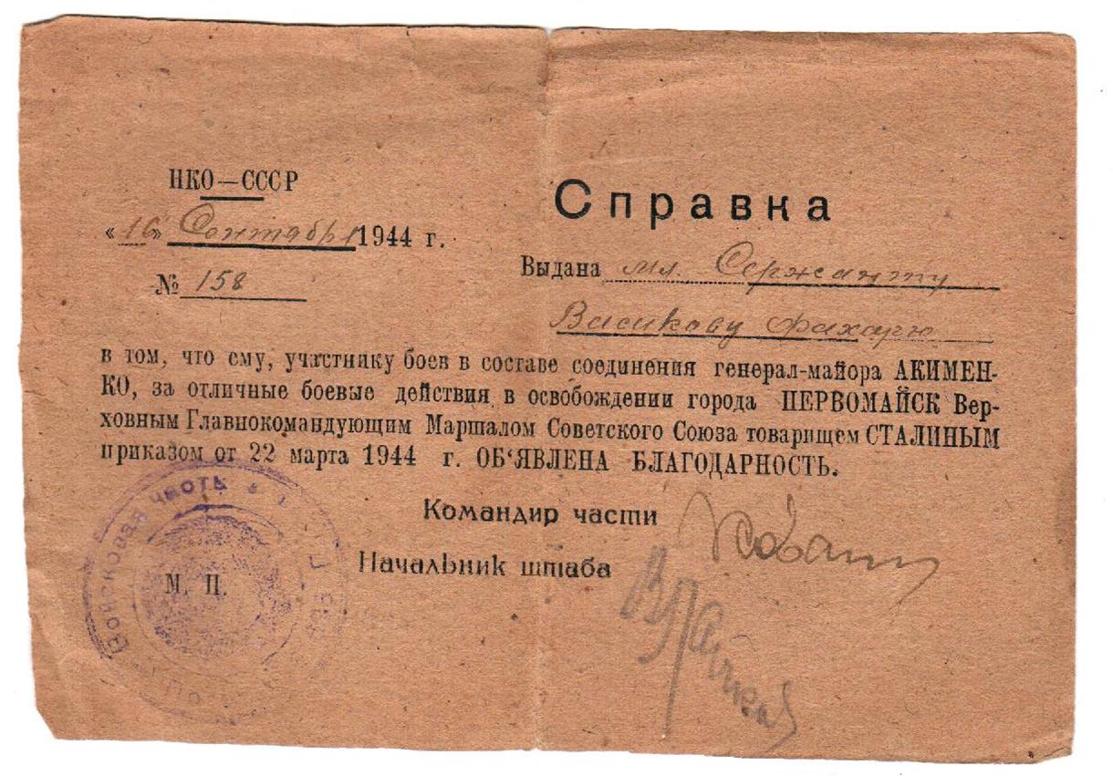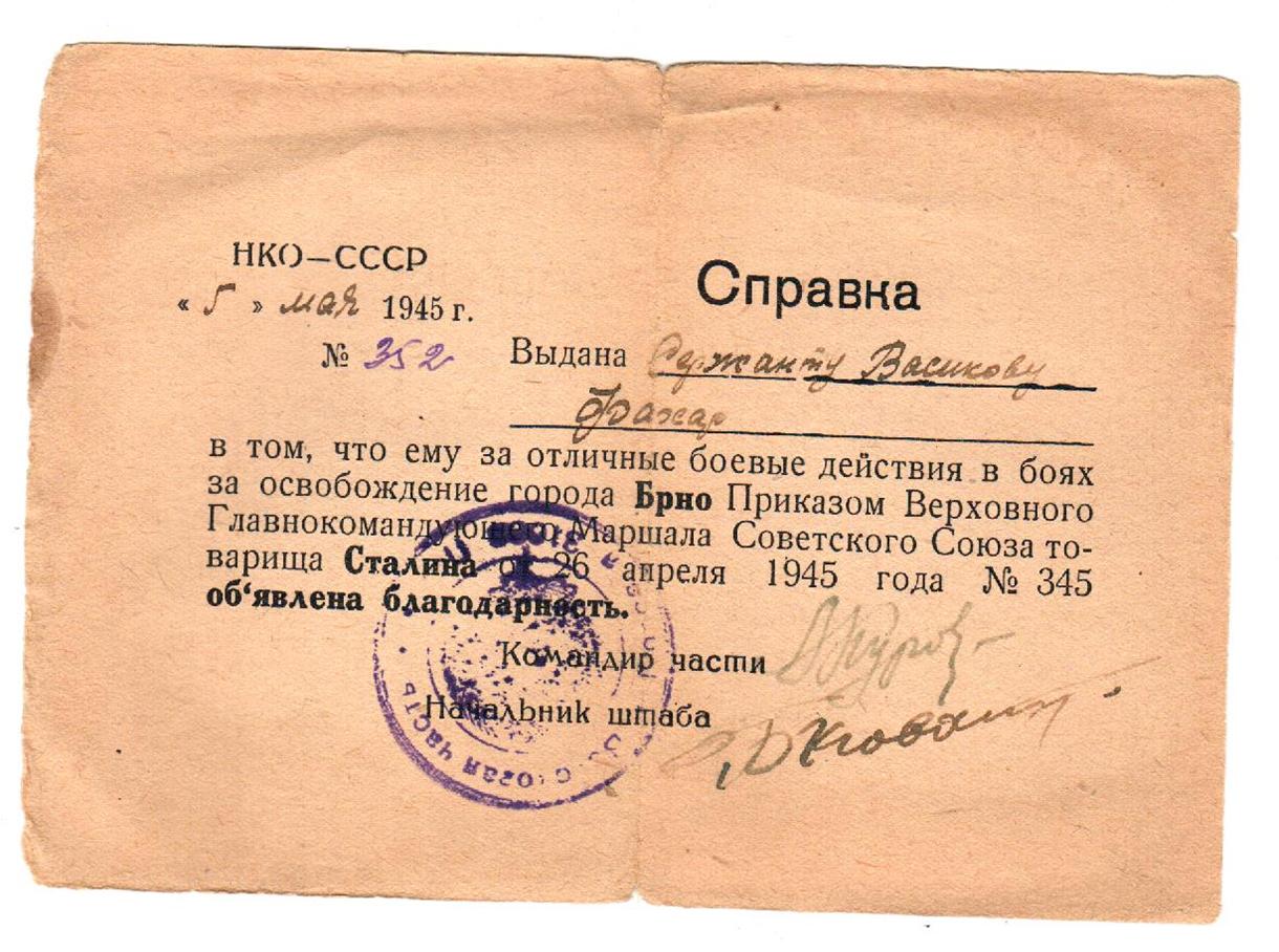Васиков Фахар (Муфахар) Васикович родился 10 января 1921 года в д.Новые Шалты Бавлинского района Татарской АССР. Окончил 7 классов, работал трактористом в Свердловской области г.Нижний Тагил, отсюда же и был призван в ряды Красной Армии 15.11.1941 года, где дослужился от младшего сержанта до старшины разведроты. За освобождение г.Зволен, г.Трансильвании, г.Брио, за отличные боевые действия при прорыве Маньчжуро-Чжалайнорского и Халун-Аршанского укрепленных районов японцев, преодоление безводных степей Монголии и форсирования горного хребта Большой Хинган Верховным Главнокомандующим Генералиссимусом Советского Союза тов. Сталиным была объявлена благодарность.