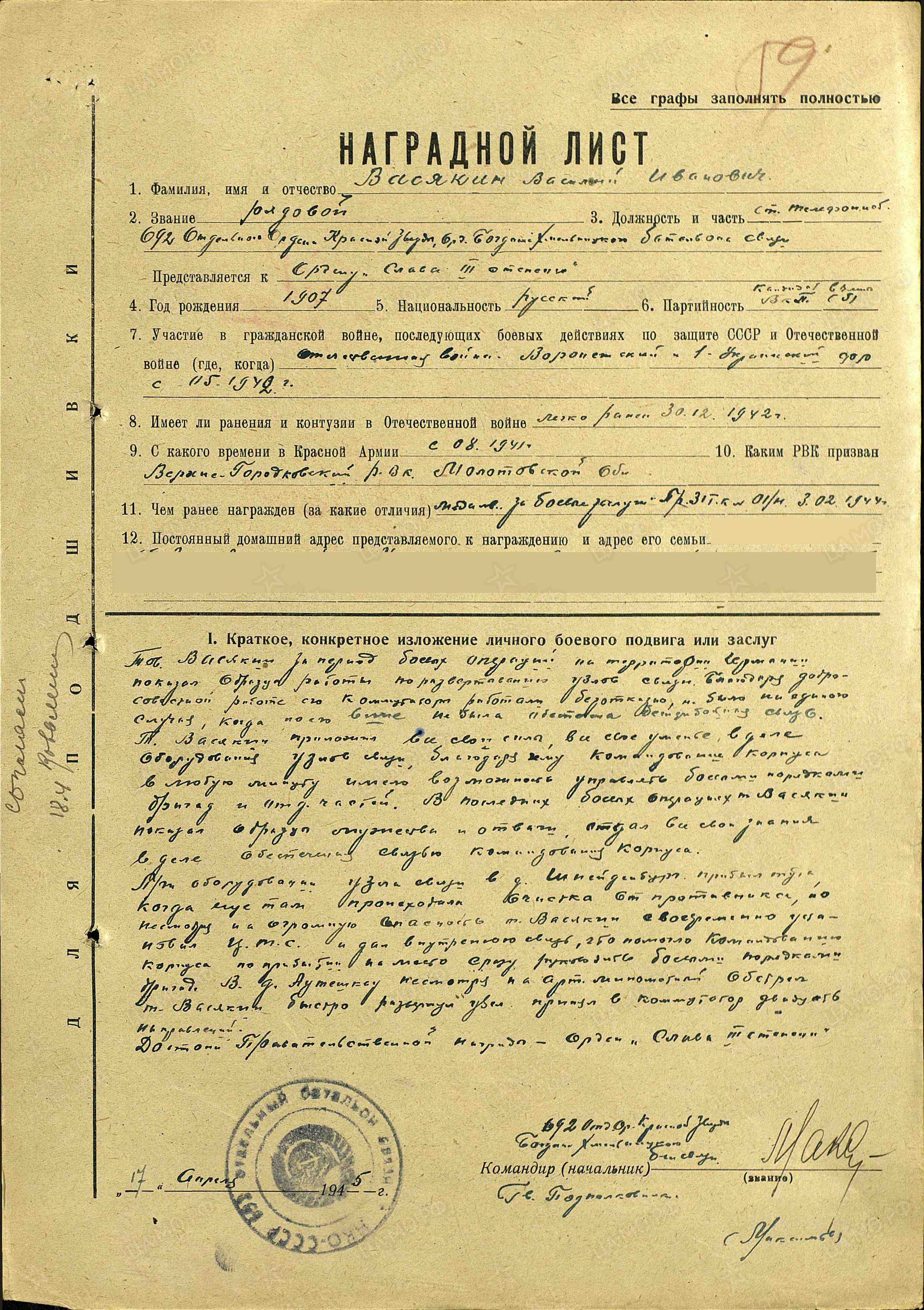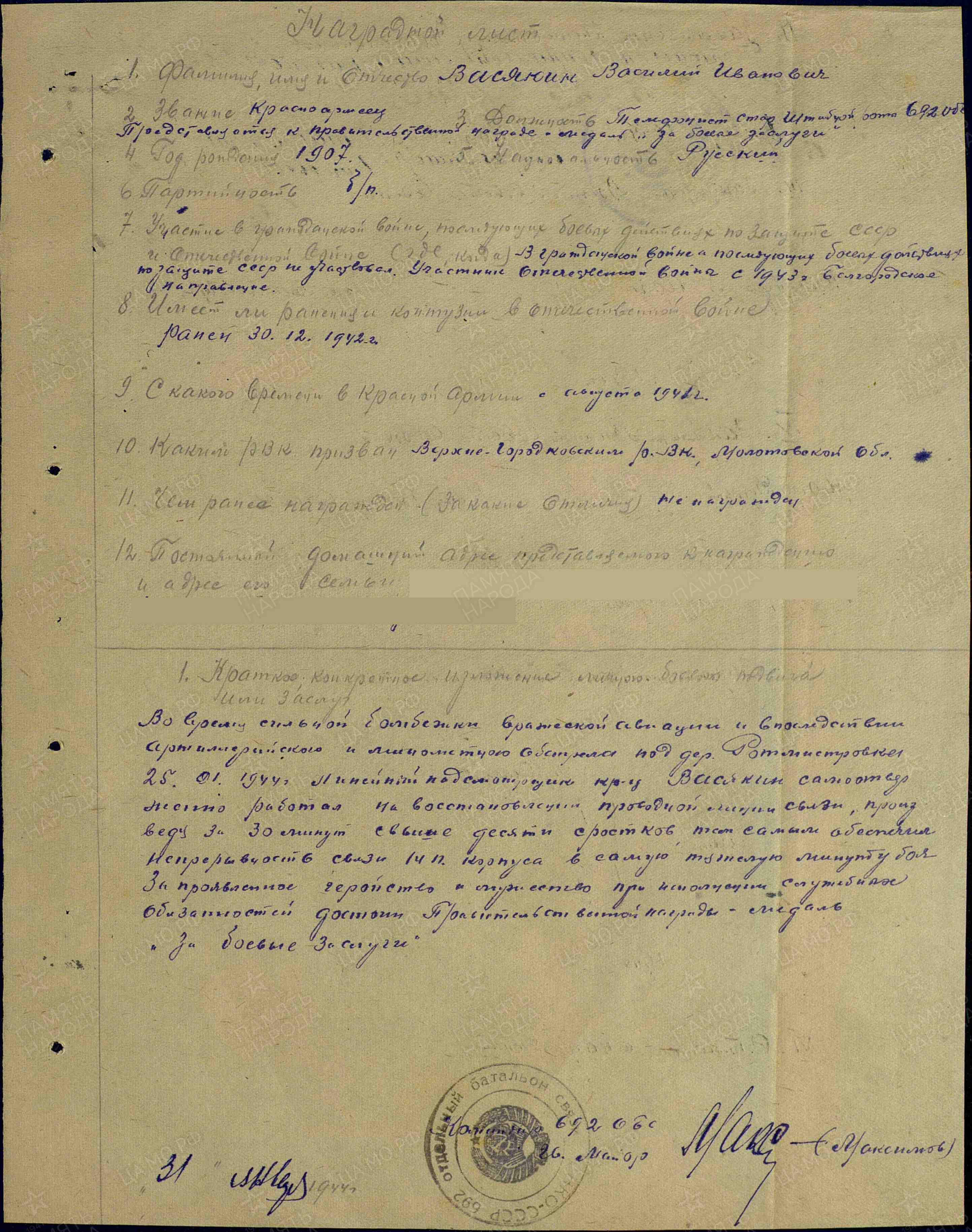 ВАСЯКИН Василий Иванович, 1907, с. Лебедино. Мобилизован Верхне-Городковским РВК Молотовской обол. (Пермский край) в августе 1941г. На фронте с мая 1942 г. Был легко ранен 30 дек. 1942. Воевал на Воронежском, 1 Украинском фронтах. Красноармеец, телефонист 692 отд. батальона связи (ОБС) 31 ТК. Награждён медалью "За боевые заслуги", орденом Славы 3 ст.