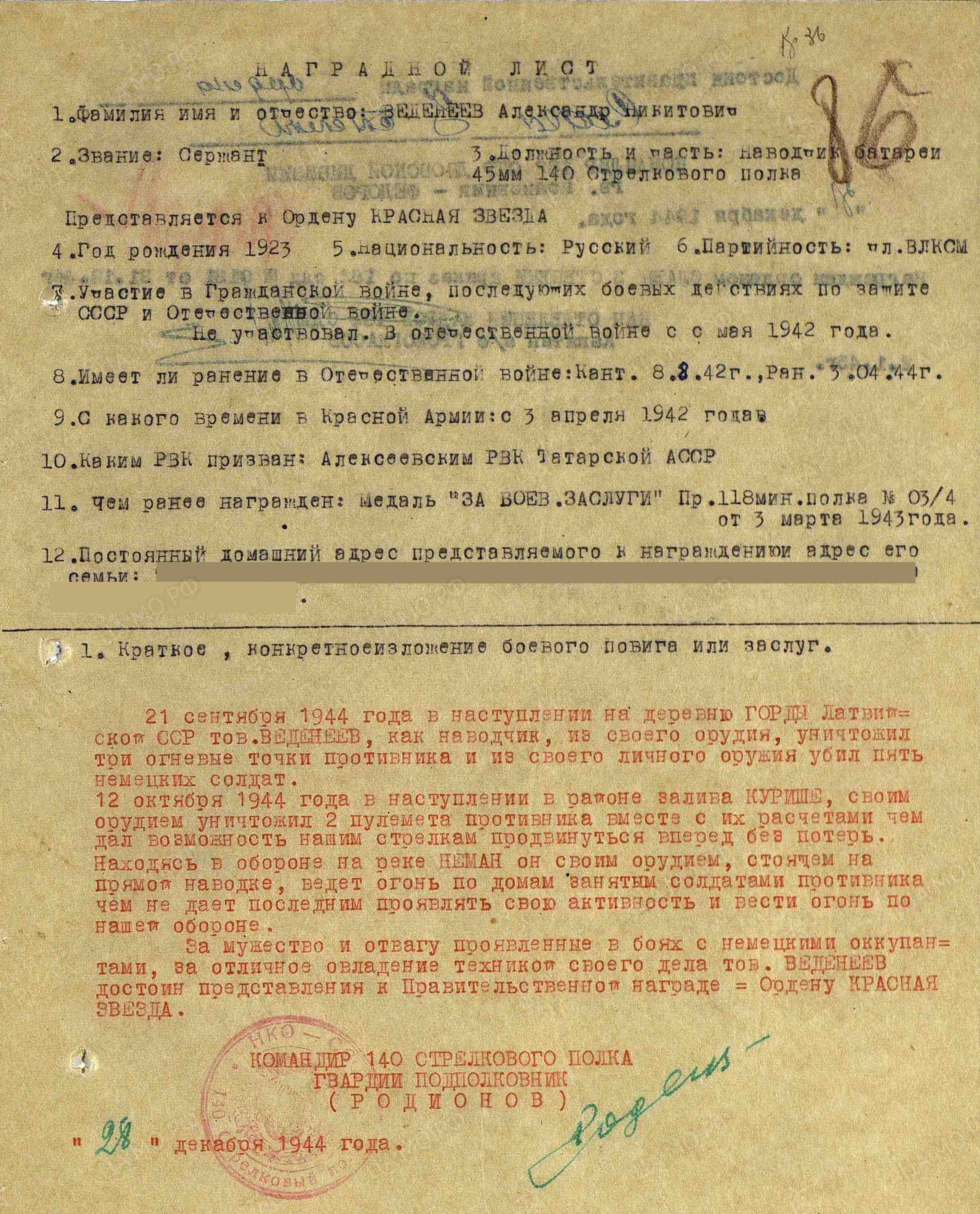 ВЕДЕНЕЕВ Александр Никитович, 1923, с. Куркуль. Мобилизован Алексеевским РВК 30 апр. 1942. Воевал на СЗФ и 1 ПрибФ. Сержант, наводчик миномёта 118 АМинП 43 А. Ранен 8 авг. 1942. В боях за г. Демидов уничтожил пять солдат противника и три огневые точки. Награждён медалью "За боевые заслуги". Ранен вторично 3 апр. 1944. После излечения - наводчик 45-мм батареи 140 СП 182 СД 90 СК. В обороне на р. Неман подавлял активность ОП врага, в боях на территории ЛатвССР уничтожил два вражеских пулемёта вместе с расчётами. Награждён орденом Славы 3 ст. Погиб 3 фев. 1945 х. Гайтенен, г. Побетен (пос. Романово), Восточная Пруссия (Калинингр. обл.).
