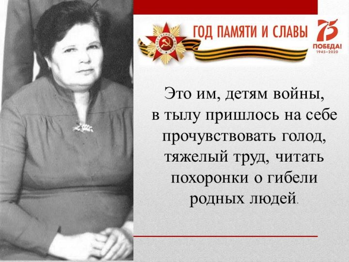 Мне запомнился день, когда узнали об окончании войны: через нашу деревню шли женщины из соседней деревни Курманаково. У них были палки, а к ним привязаны яркие красные платки. Они шли и кричали, что закончилась война. Мы бежали за ними и тоже кричали. Они пошли дальше в другие деревни, а мы вернулись обратно.