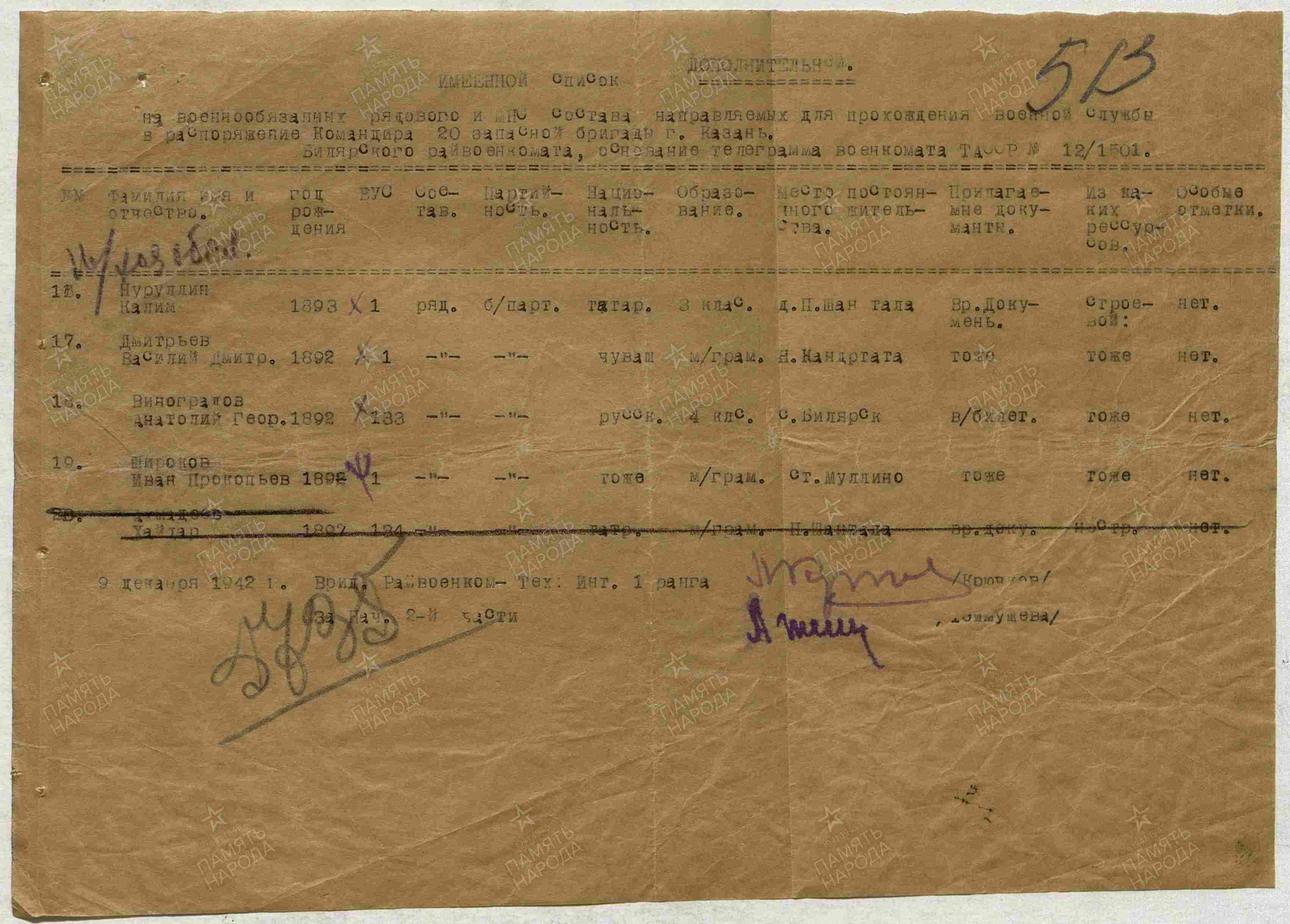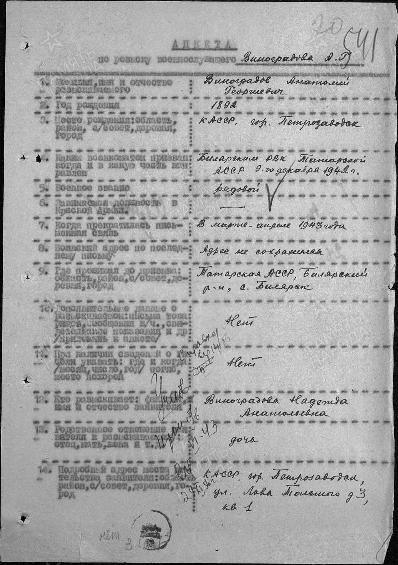 ВИНОГРАДОВ Анатолий Георгиевич, 1892(1893), г. Петрозаводск. С 1941 — в эвакуации, с. Билярск. Мобилизован Билярским РВК 9 дек. 1942. Красноармеец. Письменная связь прекратилась в марте 1943. 12 сент. 1943 через 140 запасной СП 22 А направлен в 26 СД Северо-Западного фронта. Учтён пропавшим без вести.