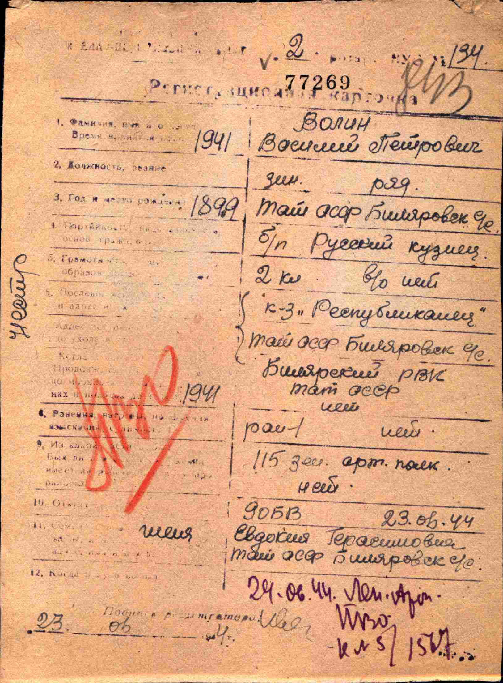 ВОЛИН Василий Петрович, 1899, д. Гоголиха. Мобилизован Билярским РВК 12 нояб. 1941. Красноармеец, 396 СП 135 СД 4 УдА/ 41 А/ 39 А Калининского фронта. С апр. 1943 проходил лечение от болезни, 1 окт. 1943 признан временно негодным. Повторно мобилизован 5 марта 1944, служил в 115 ЗенАП Ленинградской армии ПВО. Демобилизован в 1945.