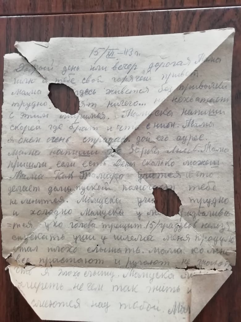 "Добрый день или вечер, дорогая мама. Шлю я тебе свой горячий привет. Мама, здесь живется без привычки трудно. Ничего ....не хватает, с этим миримся. Мамуска, напиши скорей, где брат и что с ним. Мама, я о нем очень страдаю, дай его адрес.