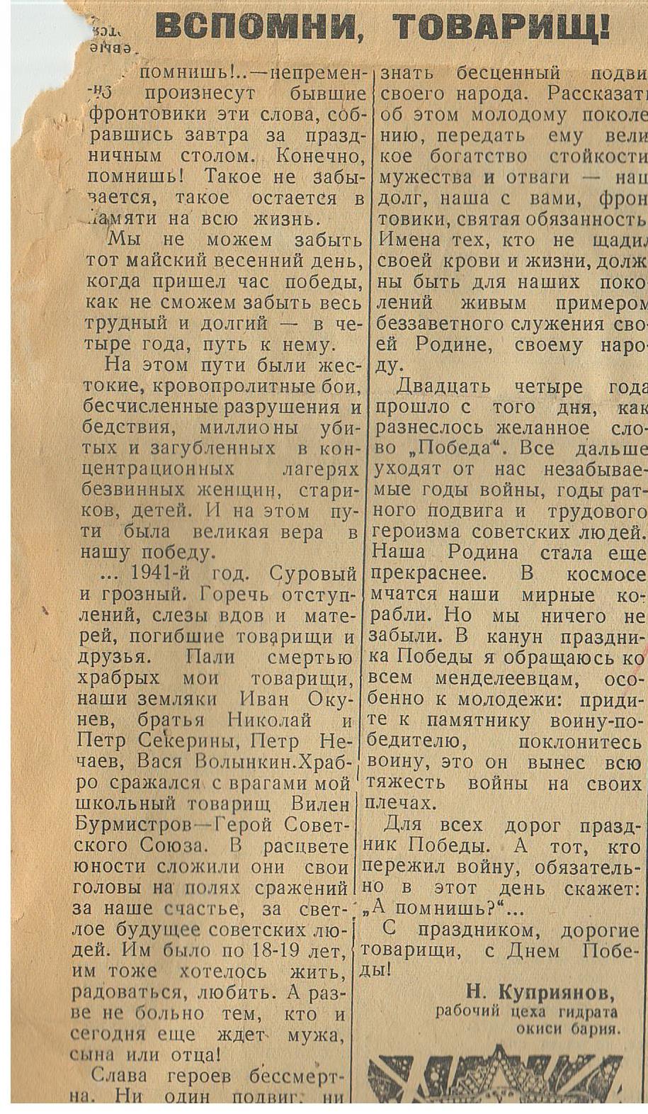 Погибшего на фронте друга юности, Васю Волынкина, вспоминает в своей статье «Вспомни, товарищ!» участник Великой Отечественной войны Николай Николаевич Куприянов, узник Бухенвальда. Газета «Заводская трибуна» 8 мая 1969 г.