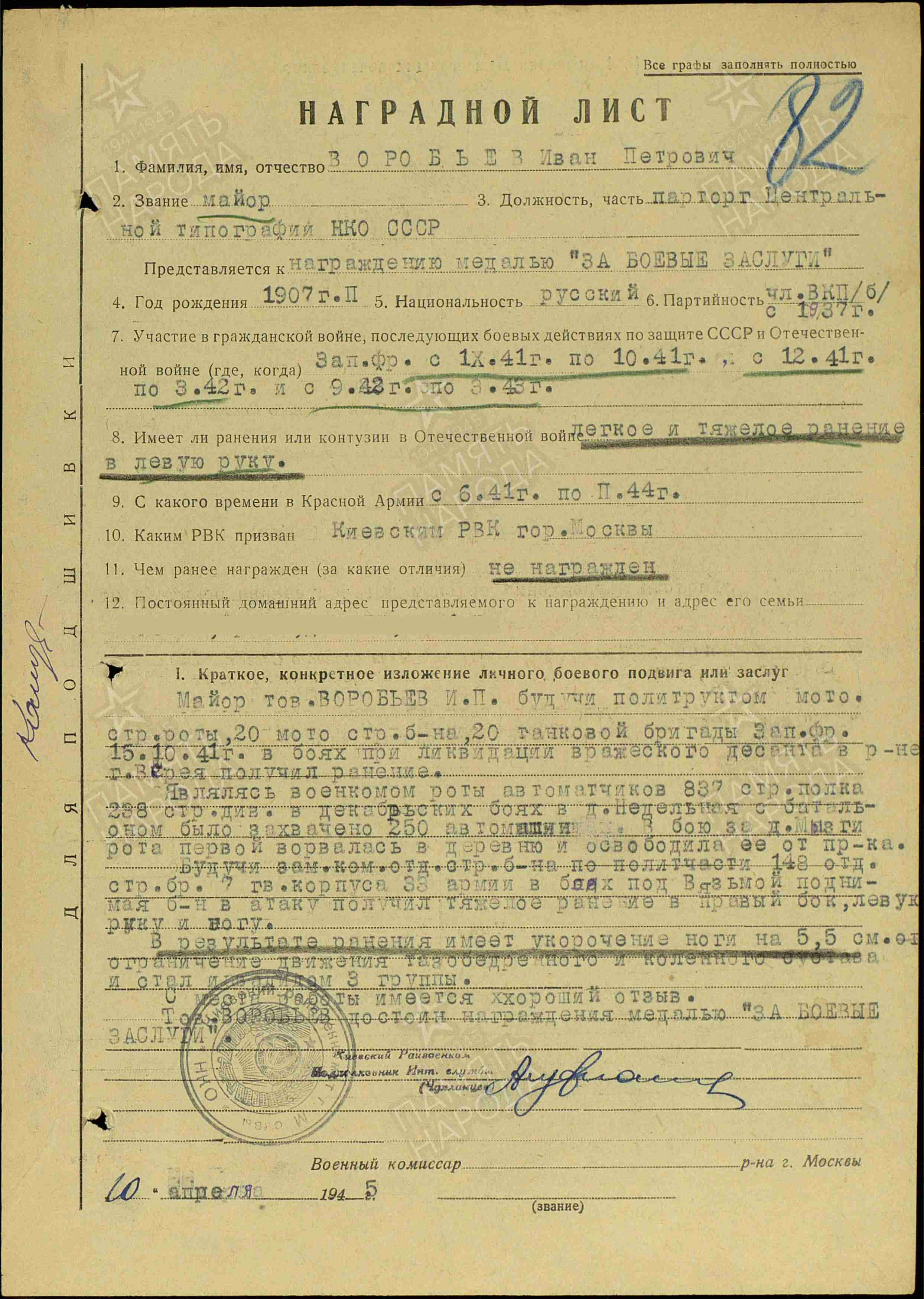 ВОРОБЬЁВ Иван Петрович, 1907, с. Саконы. Член ВКП(б) с 1937. Мобилизован в июне 1941 Киевским РВК г. Москва. Воевал на Западном фронте в составе 49 А/ 33 А/ 20 А. Участник битвы за Москву. Политрук роты мотострелкового батальона 20 ТБр/ майор, зам. ком. батальона по политической части 148 отд. СБр/ комиссар роты автоматчиков 837 СП 238 СД. Легко ранен в левую руку в окт. 1941, тяжело ранен в правый бок, левую руку и ногу в марте 1943. Находился на лечении в ЭГ 1057, г. Иваново, ЭГ 502, Смоленская обл., ЭГ 1072, г. Москва. В результате ранение установлено укорочение ноги на 5,5 см, ограниченность движения тазобедренного и коленного сустава. Уволен 16 фев. 1944 по инвалидности 3 гр. Работал парторгом Центральной типографии Наркомата обороны до 1954. Награждён медалью "За оборону Москвы", орденом Отечественной войны 2 ст. Указом Президиума ВС СССР от 6 авг. 1946.
