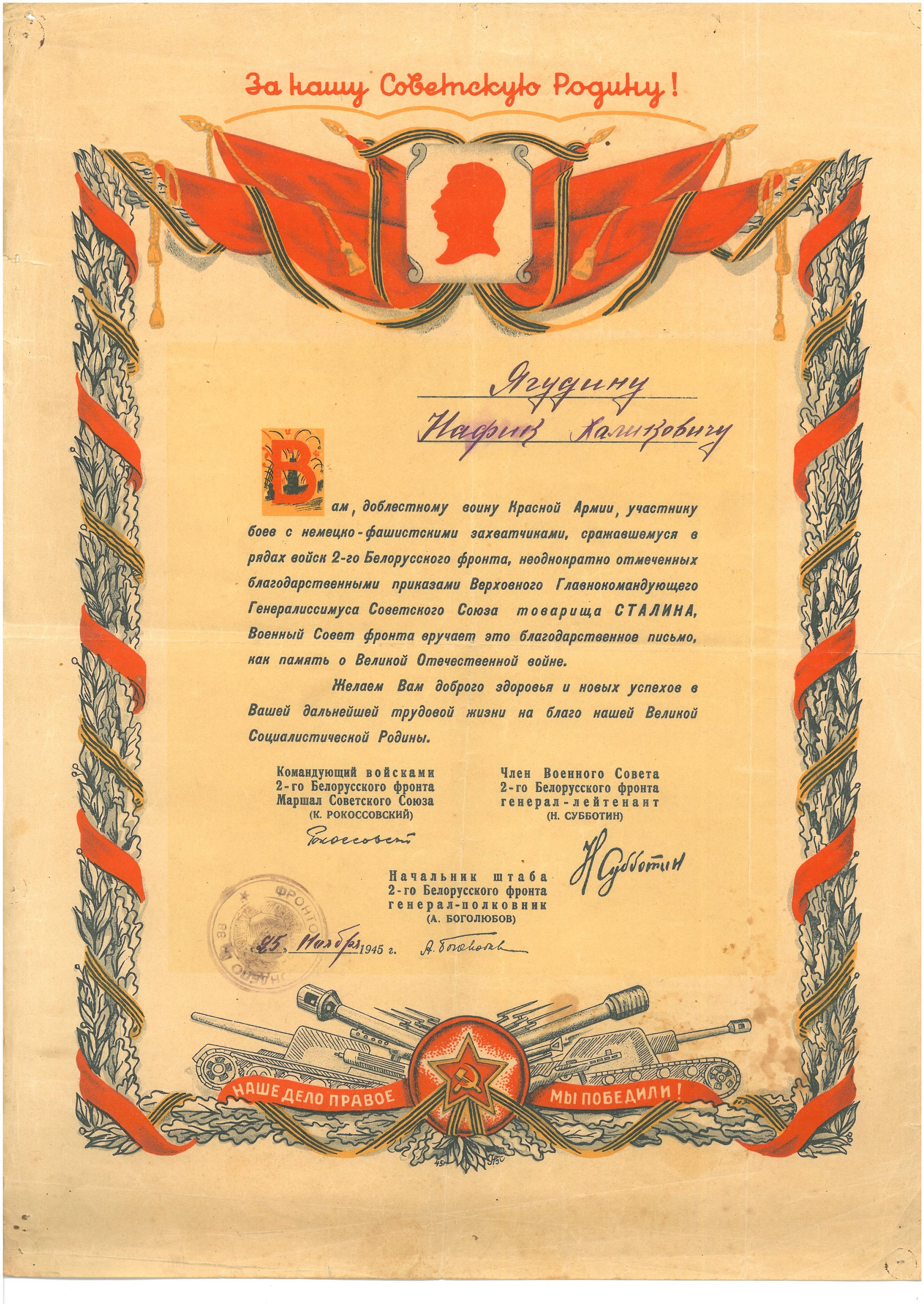 От имени Верховного Совета СССР командира отделения 135 Отдельного Миномётного дивизиона 171 стрелковой дивизии сержанта Ягудина Нафика Халиковича наградить медалью “За боевые заслуги”.