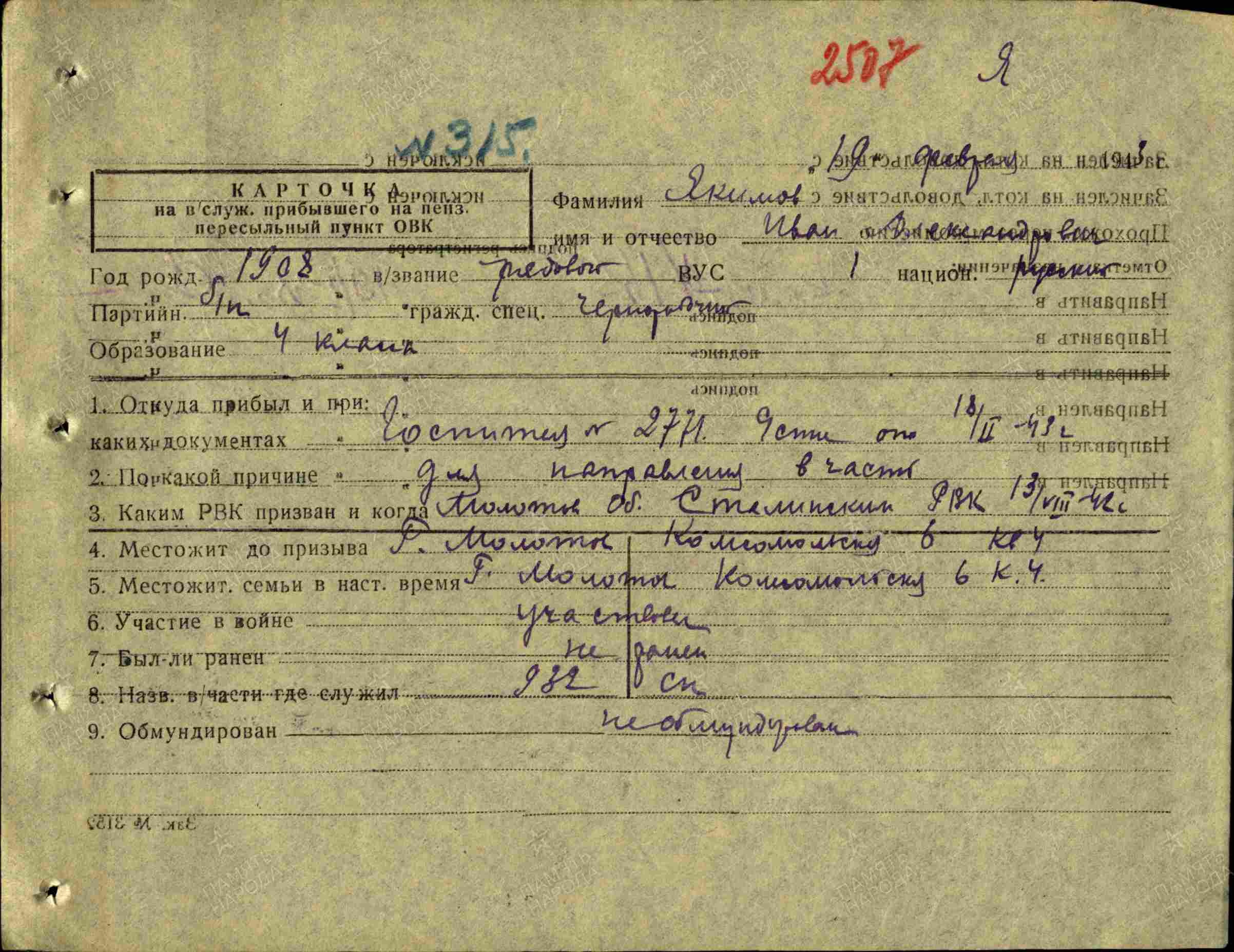 ЯКИМОВ Иван Александрович, 1908, д. Сабакайка. Мобилизован Сталинским РВК (Молотовским ГВК) г. Молотов (Пермь) 13 авг. 1942. Член ВКП(б). Красноармеец, 932 СП 252 СД 21 А Донского фронта. Ранен 4 янв. 1943. На лечении – в ЭГ 2771, г. Пенза. После излечения – ефрейтор, заряжающий батареи 120 мм миномётов 530 СП 156 СД в составе 68 А ЗапФ, 4 УдА/ 51 А/ 43 А 1 ПрибалтФ. Награждён двумя медалями «За отвагу» (1944, 1945), медалью «За боевые заслуги» указом Президиума ВС СССР от 1 мая 1946.