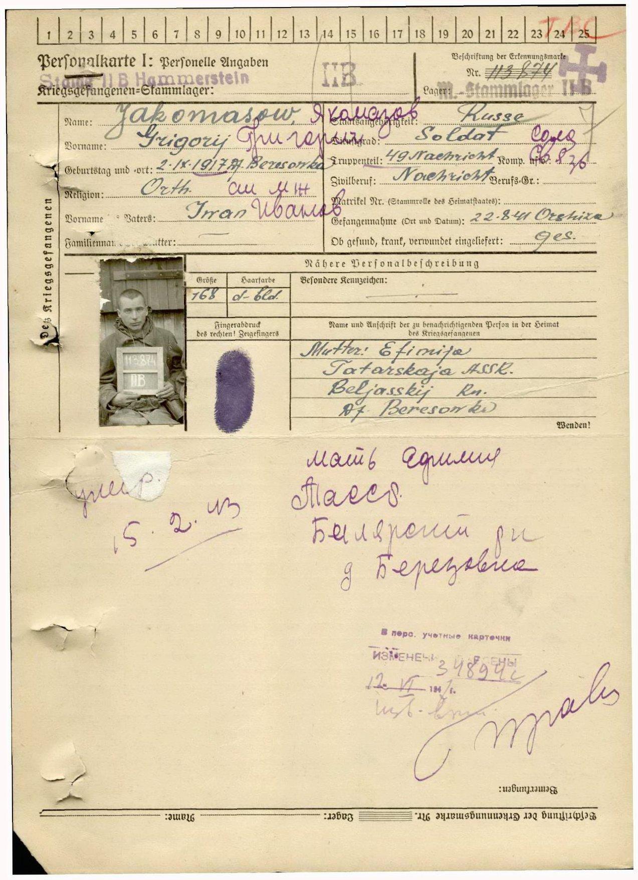 ЯКОМАЗОВ Григорий Иванович (1917 г.р., д. Берёзовка). Красноармеец, связист, 49 батальон (полк?) связи. Попал в плен 22.08. 1941 г. у г. Орша. Умер 15.02.1943г. в лагере в/пленных IIB, г. Хаммерштайн, Польша.