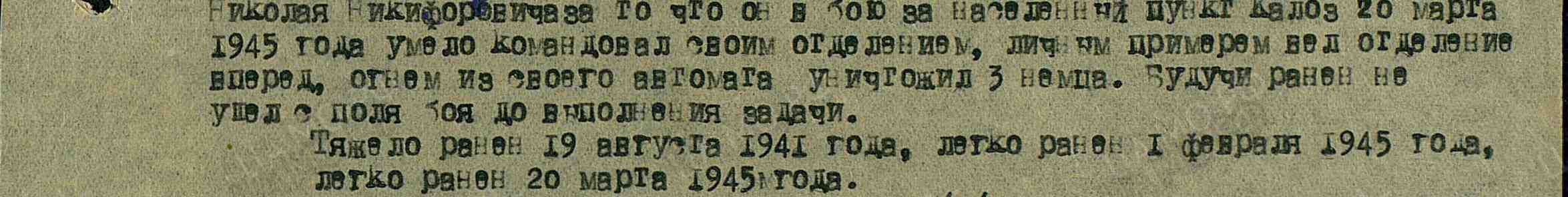 В боях был тяжело ранен 19.08.1941 года, легко ранен 02.02.1945 года и 20.03.1945 года.