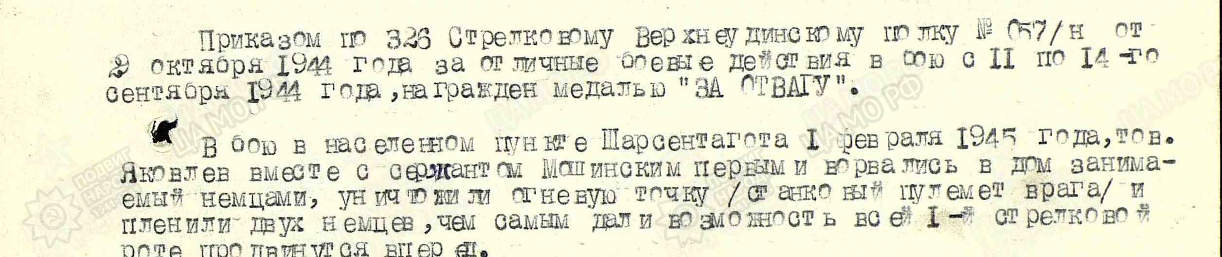 Из наградного листа от 06.02.1945 года: «В бою в населенном пункте 111 арсентагота 1 февраля 1945 года тов. Яковлев вместе с сержантом Мошинским первыми ворвались в дом,