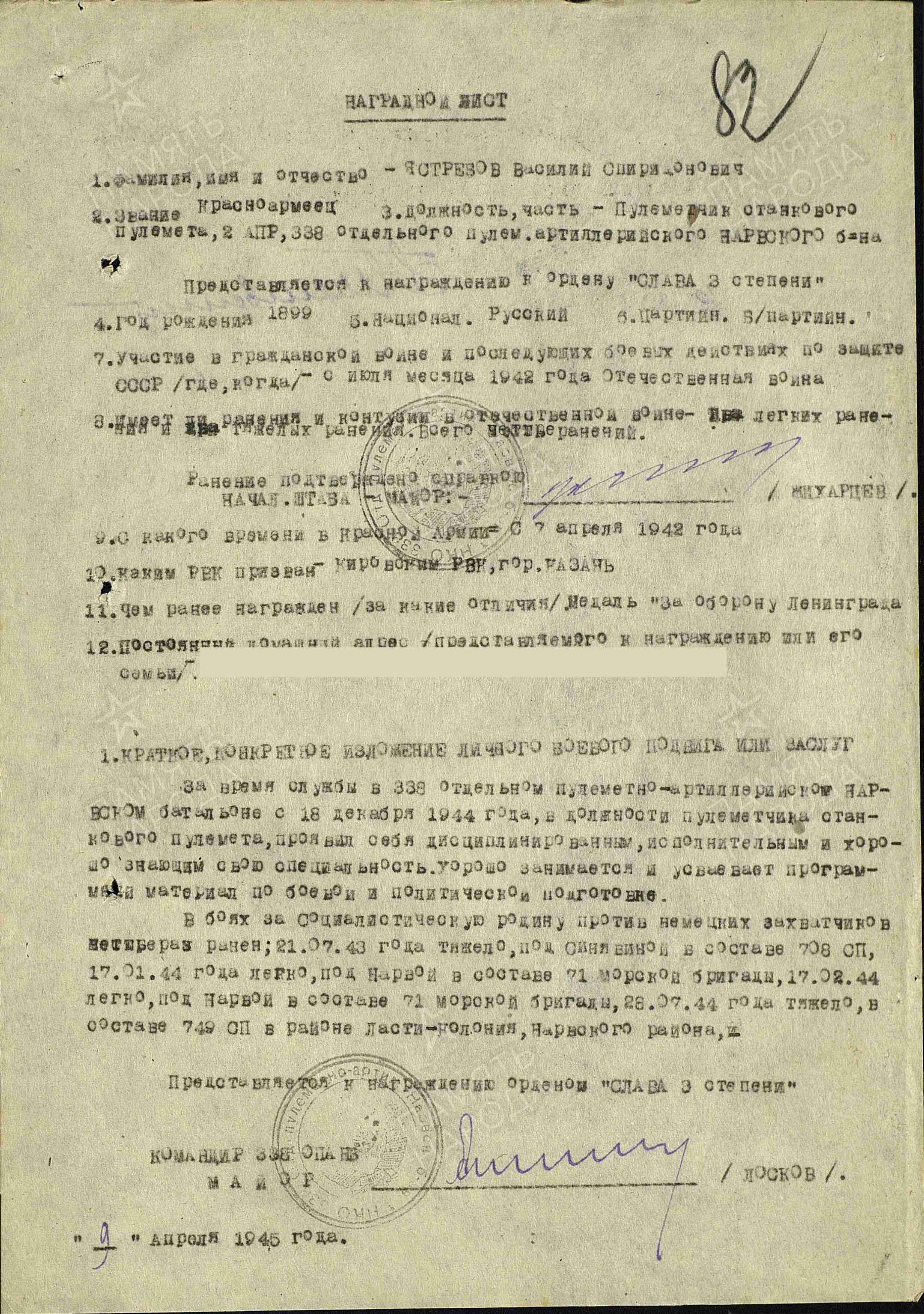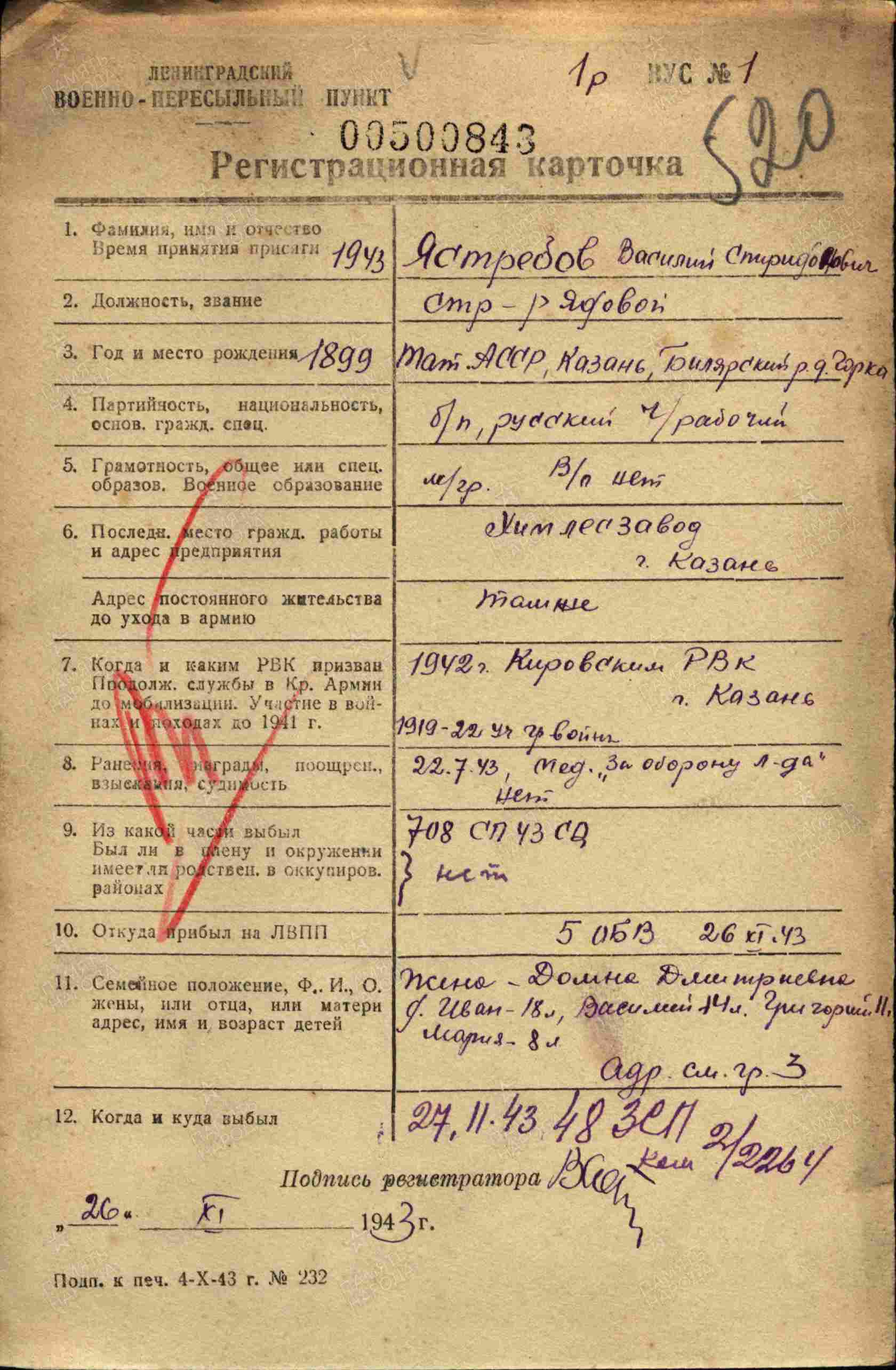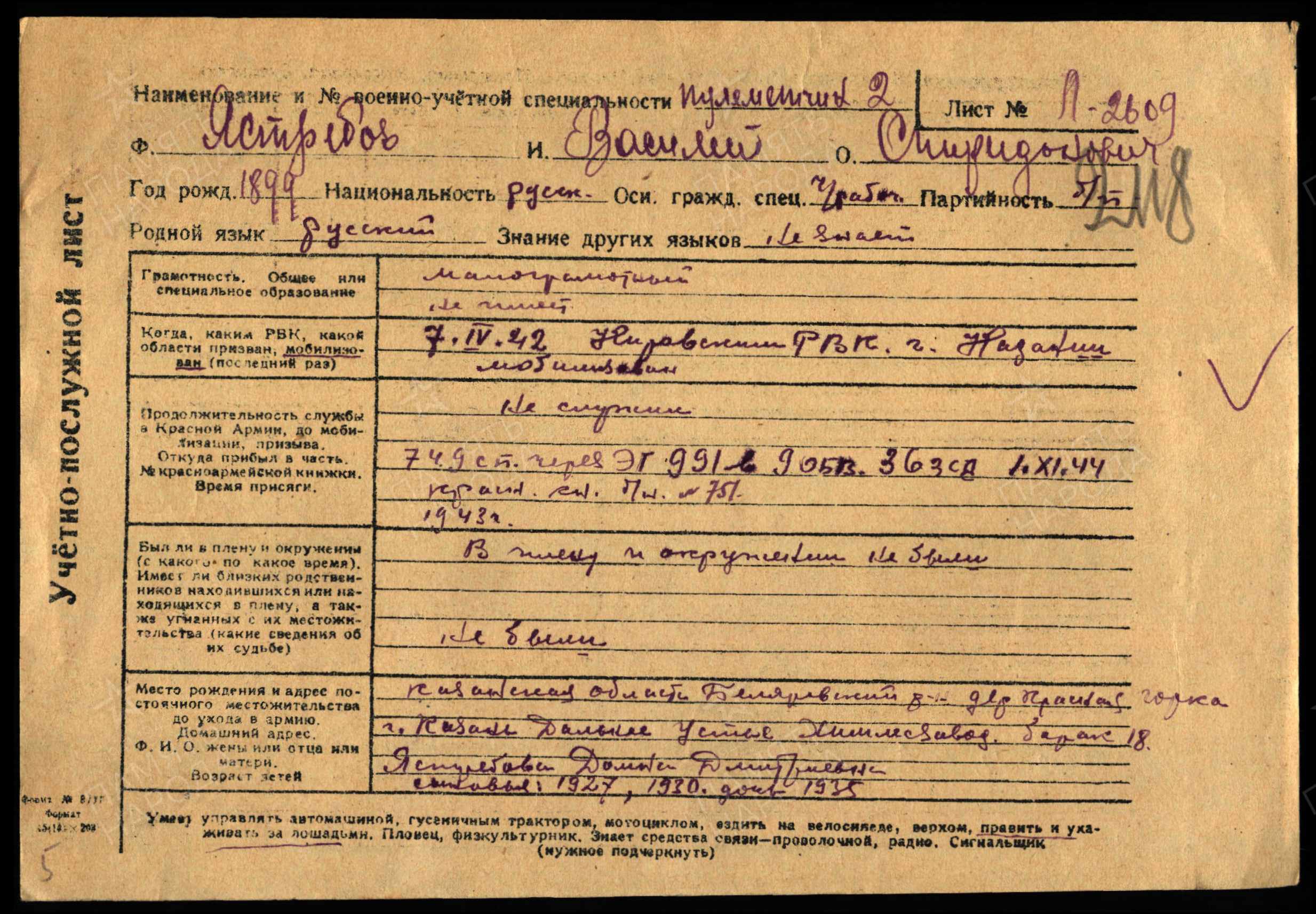 ЯСТРЕБОВ Василий Спиридонович, 1899, с. Богоявленская Горка. Участник Гражданской войны в 1919-1922. Мобилизован Кировским РВК г. Казань 7 апр. 1942. Воевал на Ленинградском фронте в составе 55 А/ 59 А/ 23 А/ Приморской ОГ/ 2 УдА. Красноармеец, стрелок 708 СП 43 СД/ понтонёр 18 отд. моторизизованного понтонного батальона/ пулемётчик 749 СП 125 СД/ 71 отд. морской СБр/ 338 отд. пулемётно-артиллерийского батальона 17 УР. Участник прорыва блокады Ленинграда. В боях перенёс, по разным данным, от четырёх до шести ранений, из них не менее двух тяжёлых. Находился на лечении в различных госпиталях г. Ленинград: ЭГ 1116, ЭГ 921. ЭГ 2222, ЭГ 2014, ГЛР 4174. Награждён медалью «За оборону Ленинграда», орденом Отечественной войны 2 ст. (1945).