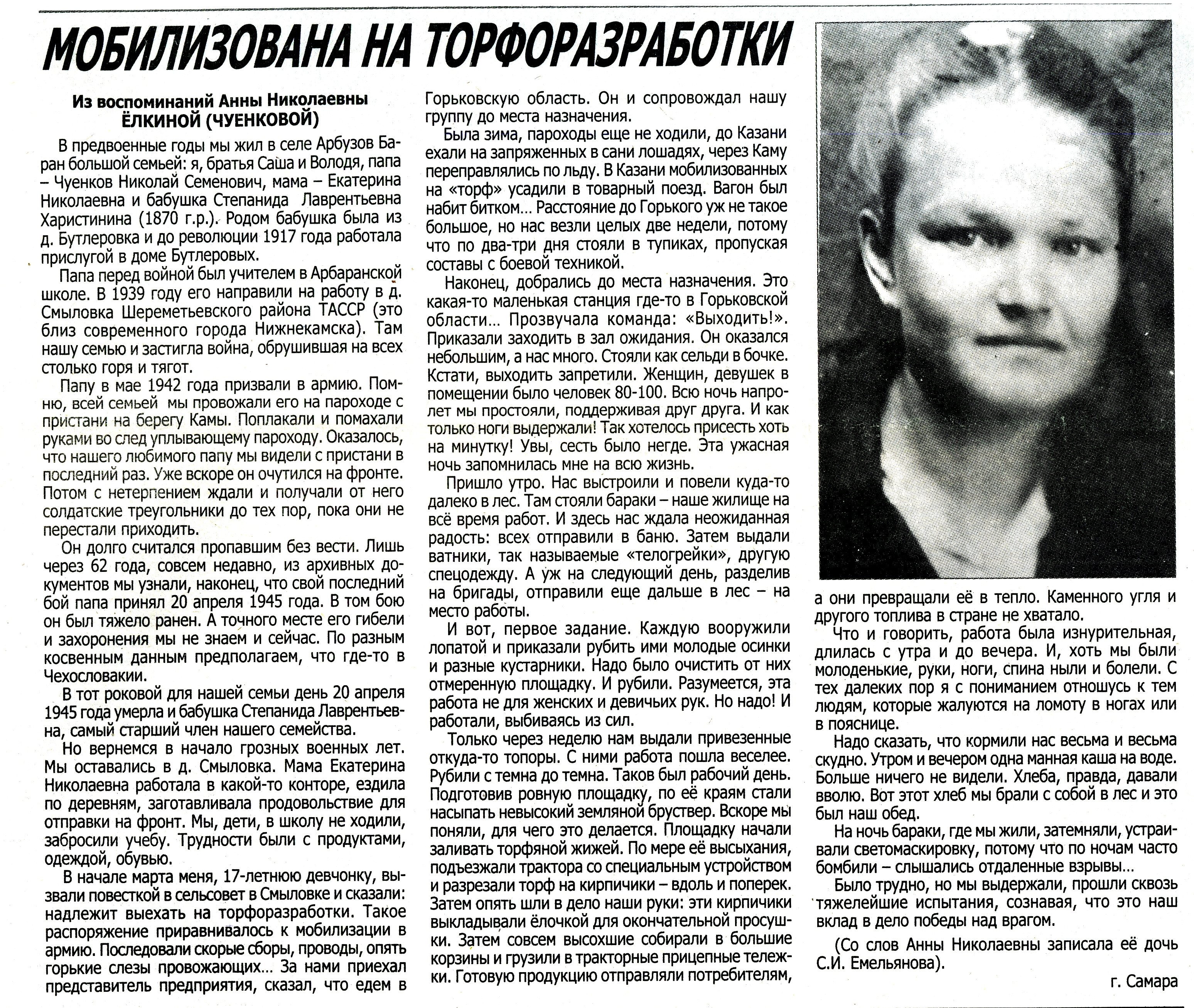 Родилась в 1924 г. в с. Арбузов Баран. Перед войной семья проживала в Шереметьевском (Нижнекамском) р-не. В марте 1942 г. была мобилизована через сельский совет и РВК на торфоразработки в Горьковскую область.