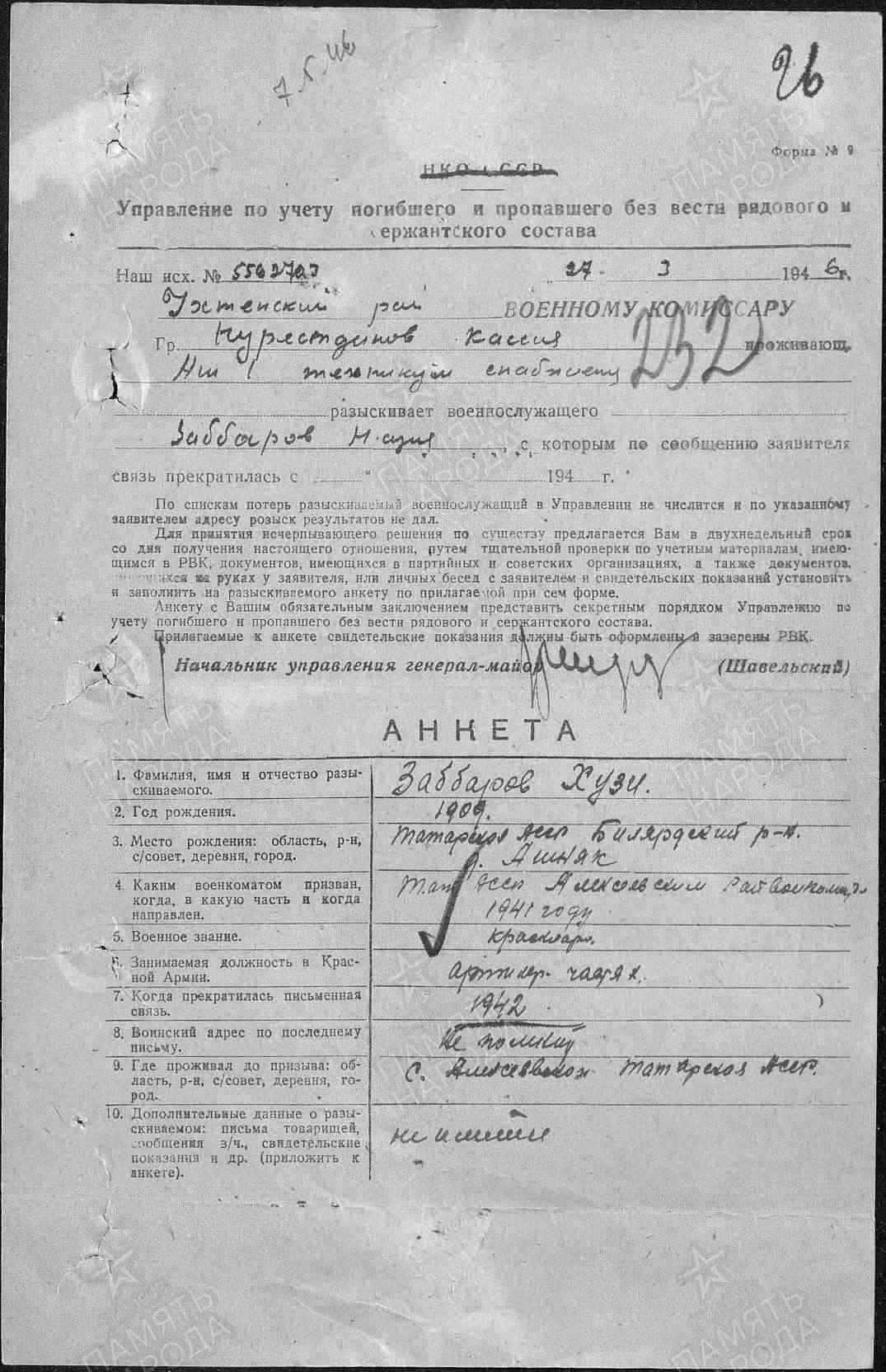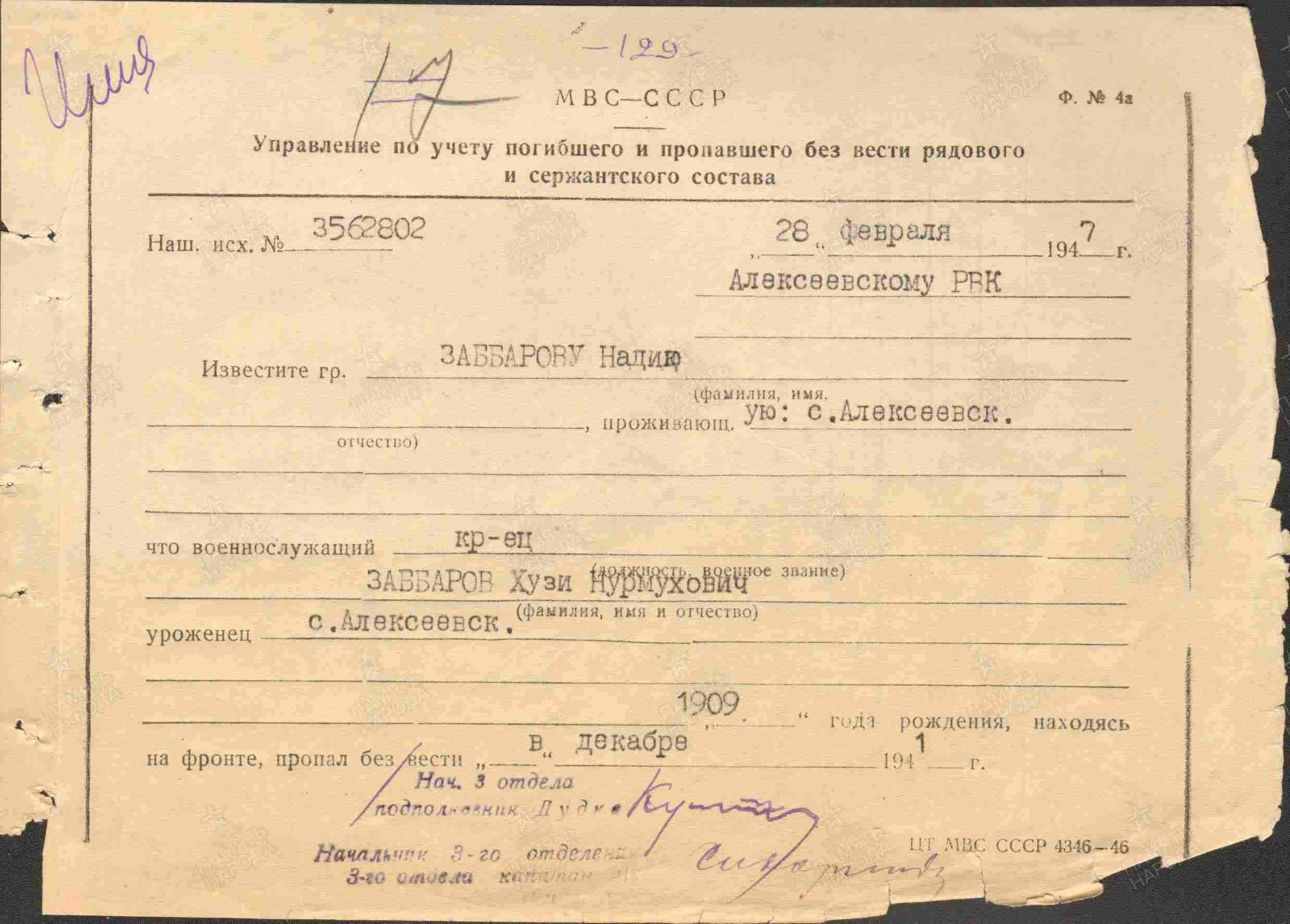 ЗАББАРОВ Хузи Нурхаметович, 1909, д. Ошняк. Жил в с. Алексеевское. Мобилизован Алексеевским РВК 24 июня 1941. Красноармеец, артиллерист. Письменная связь с семьей прекратилась с 6 сент. 1941. Пропал без вести.