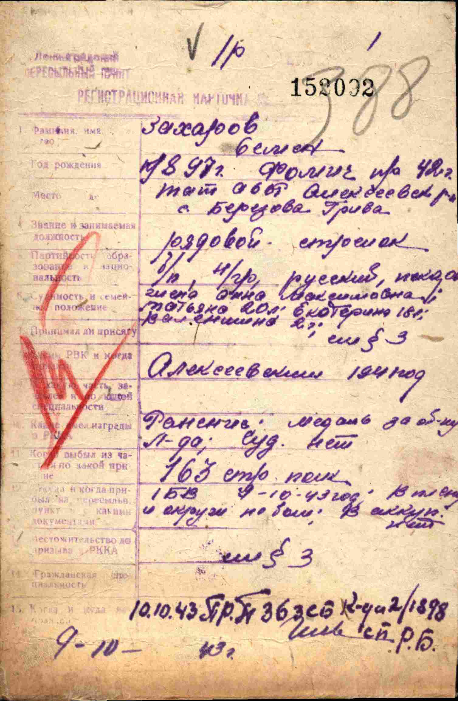ЗАХАРОВ Семён Фомич, 1897, с. Берёзовая Грива. Мобилизован Алексеевским РВК 2 окт./ 13 нояб. 1941. Воевал на Ленинградском, Волховском, 3 и 2 Прибалтийском фронте. Красноармеец, 163 СП/219 СП 11 СД в составе 55 А/ 54 А/ 8 А/ 2 УдА/ 67 А/ 59 А/ 1 УдА/ 42 А/ 22 А. В 1943 перенёс ранение, находился на излечении в ЭГ 1114, г. Ленинград. Награждён медалью «За оборону Ленинграда». По неточным данным - умер от ран в апр. 1945. Военкоматом дважды учтён пропавшим без вести (1942, 1945).