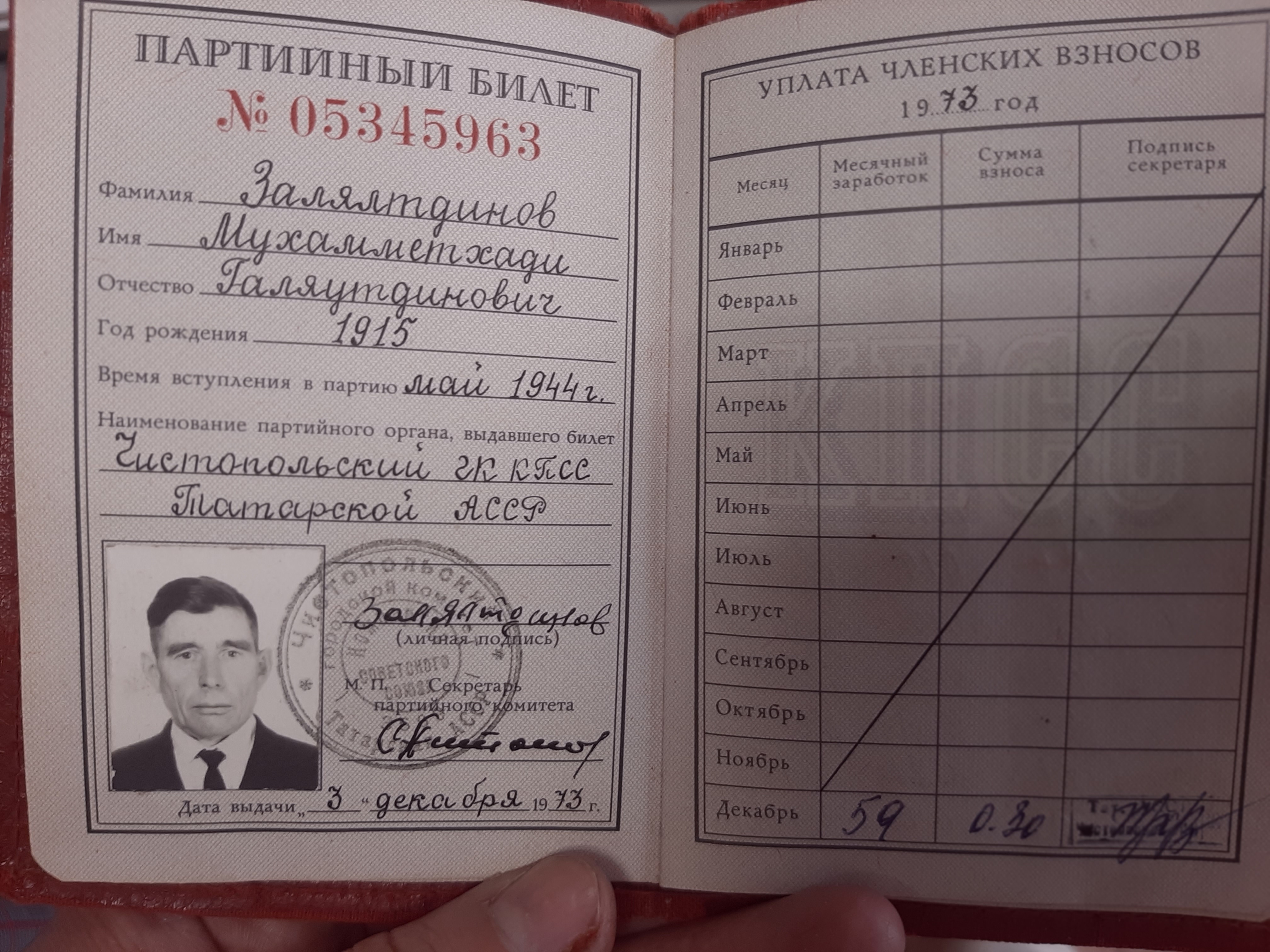1947 года с боевыми медалями «За оборону Ленинграда», «За победу над Германией в Великой Отечественной войне 1941-1945 гг.», «За победу над Японией». Каждый раз, получая юбилейные медали, ветеран ВОв мечтал, чтобы ужас войны больше не коснулся наших людей. Ему посчастливилось: он не был ни ранен, ни контужен, но в груди болела не залечивающаяся рана, боль по погибшим товарищам, по израненной стране. Он много и добросовестно трудился в своём селе, его избирали парторгом, назначали зав. фермой, бригадиром, кладовщиком — все порученное он выполнял очень добросовестно. В августе 1976 года ему была вручена медаль «Ветеран труда». Со своей женой Хатимой М.Г.Залялтдинов воспитал 5 достойных дочерей.