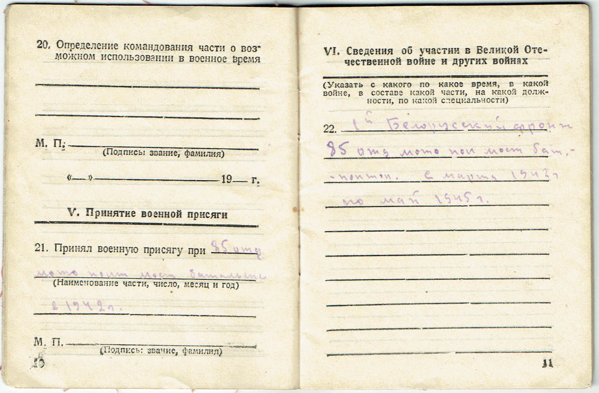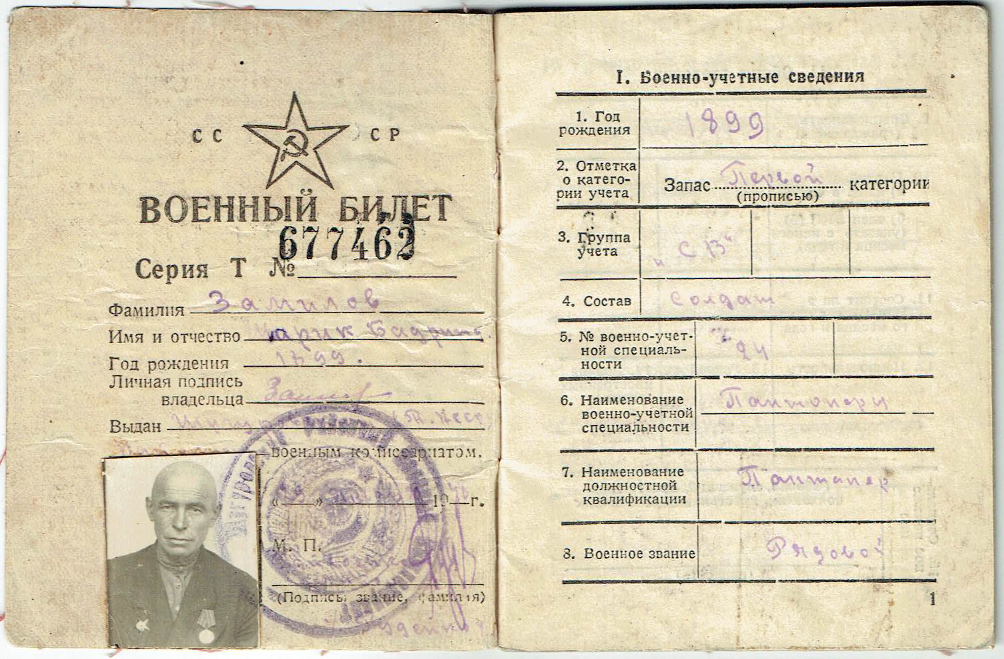 Призван 03.1942г. Первомайским (Черемшанским) РВК ТАССР. Воинское звание красноармеец; рядовой. Воинская часть 85 отдельный моторизованный понтонно-мостовой батальон 1 Белорусский фронт.