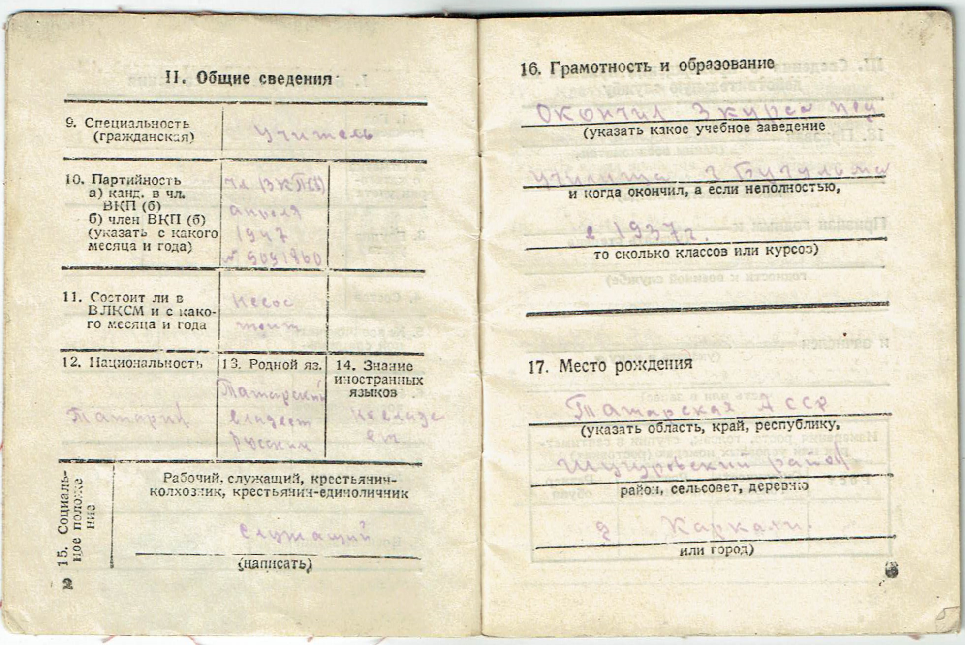 Родился 1899 г. в д. Каркали Шугуровского района. До войны работал учителем.