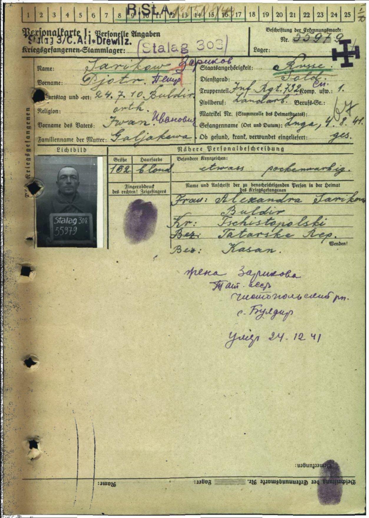 Родился 24 июля 1910 г. в с. Булдырь Чистопольского уезда Казанской губернии. Пленён 4 августа 1941 г. под Лугой. Содержался в шталаге VIII E (308). Лагерный номер 55979. Рядовой 732 стрелкового полка Зарипов Петр Иванович погиб в плену 24 декабря 1941 г. Захоронен в Польше в Альт-Древитце.