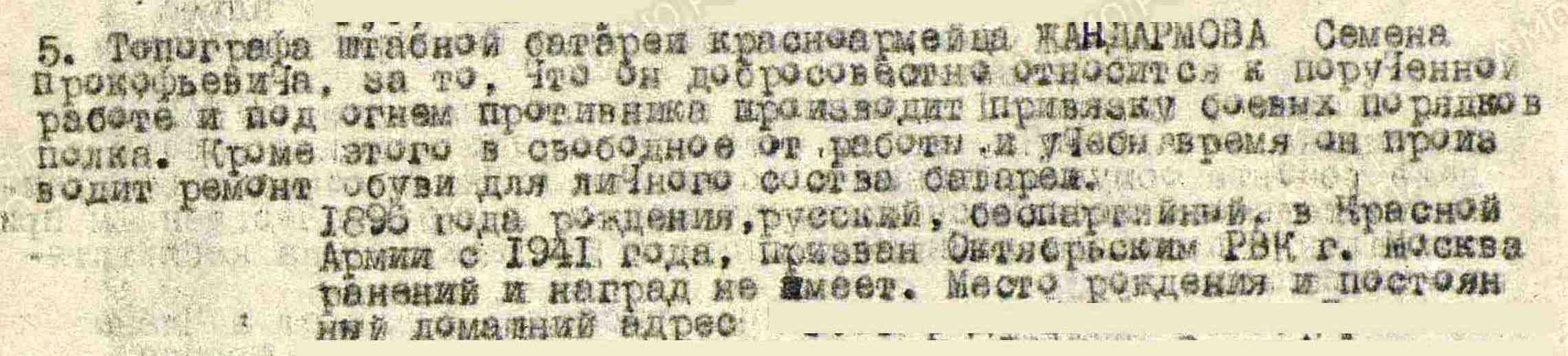 ЖАНДАРМОВ Семён Прокофьевич, 1896, д. Войкино. Мобилизован Октябрьским РВК г. Москва 3 авг. 1941. Красноармеец. С 26 дек. 1942 по 24 июля 1943 воевал в составе 24 СБр 4 А Волховского фронта. В 1945 – топограф штабной батареи 495 АП 123 СД в составе 67 А/ 2 УдА/ 42 А/ 59 А/ 8 А/ 1 УдА на Ленинградском и 2 Прибалтийском фронте. Награждён медалью «За боевые заслуги».