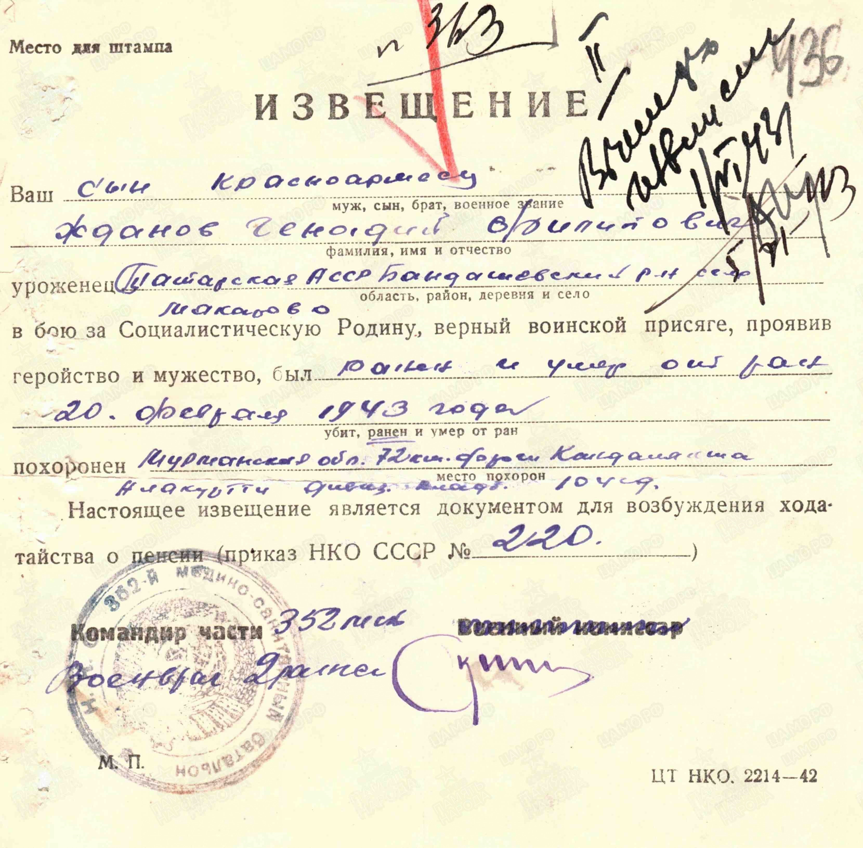 Получил сквозное пулевое ранение, обморожение стоп. Умер от ран в дороге 20.02.1943 г.