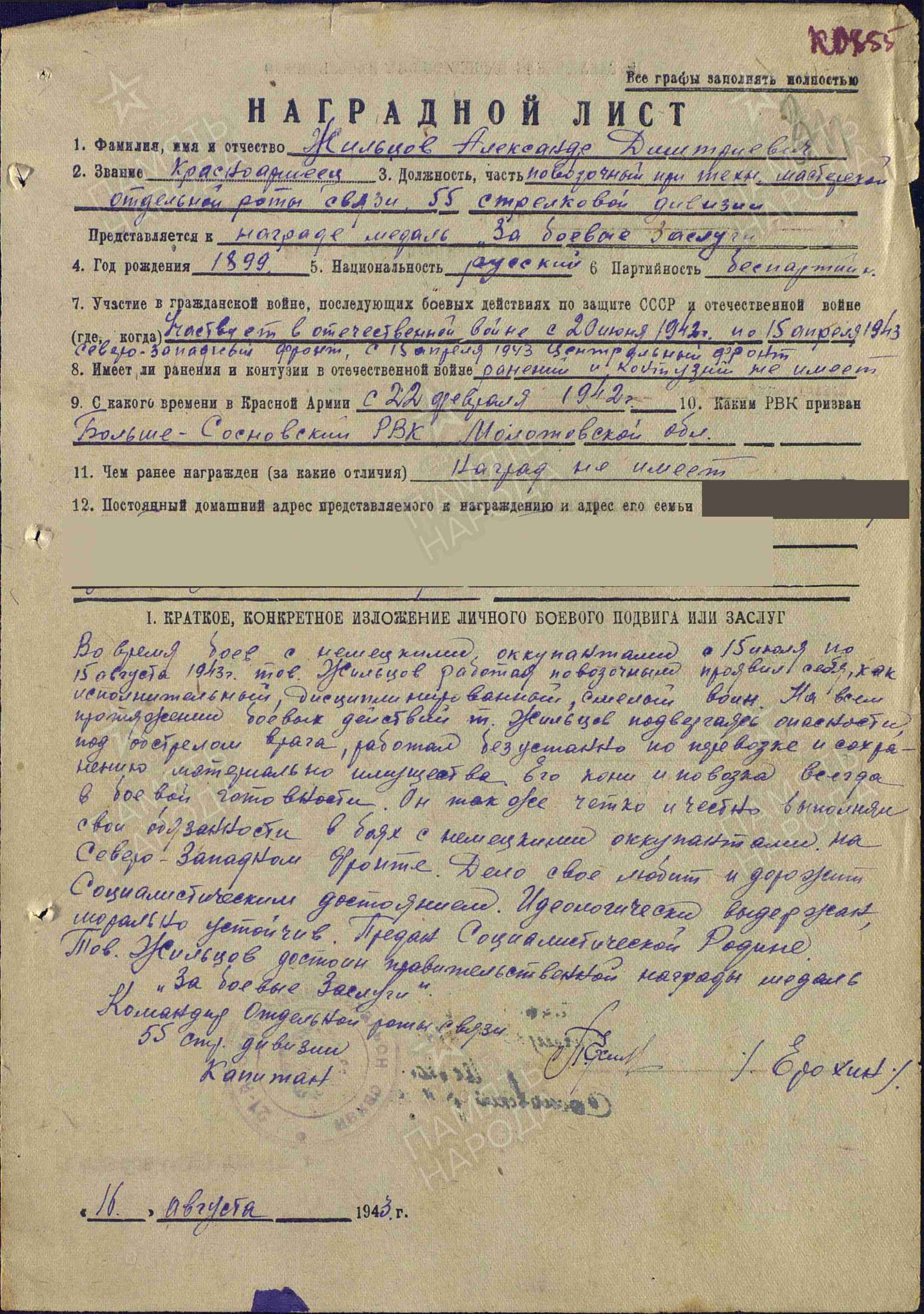 ЖИЛЬЦОВ Александр Дмитриевич, 1899, с. Билярск. Мобилизован 2 фев. 1942 Большесосновским РВК Молотовской обл. (Пермский край). С 20 июня 1942 воевал на Северо-Западном, Центральном, Белорусском, 2 и 1 Белорусском, 3 Прибалтийском фронте в составе 11 А/ 27 А/ 60 А/ 70 А/ 61 А. Участник битвы на Курской дуге, освобождения Белоруссии, Польши, Прибалтики. Красноармеец, ездовой 111 СП/ повозочный технической мастерской 21 отд. роты связи 55 СД. Награждён медалью «За боевые заслуги».