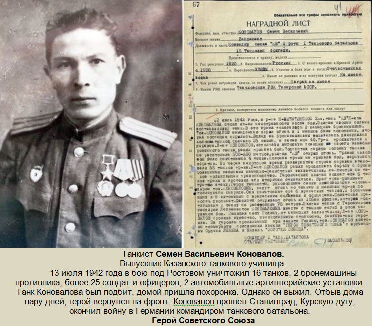 Легендарный танкист, Семён Коновалов, подвиг которого лёг в основу фильма Алексея Пиманова «Несокрушимый». 13 июля 1942 года в бою под Ростовом на танке КВ-1 он уничтожил 16 танков!