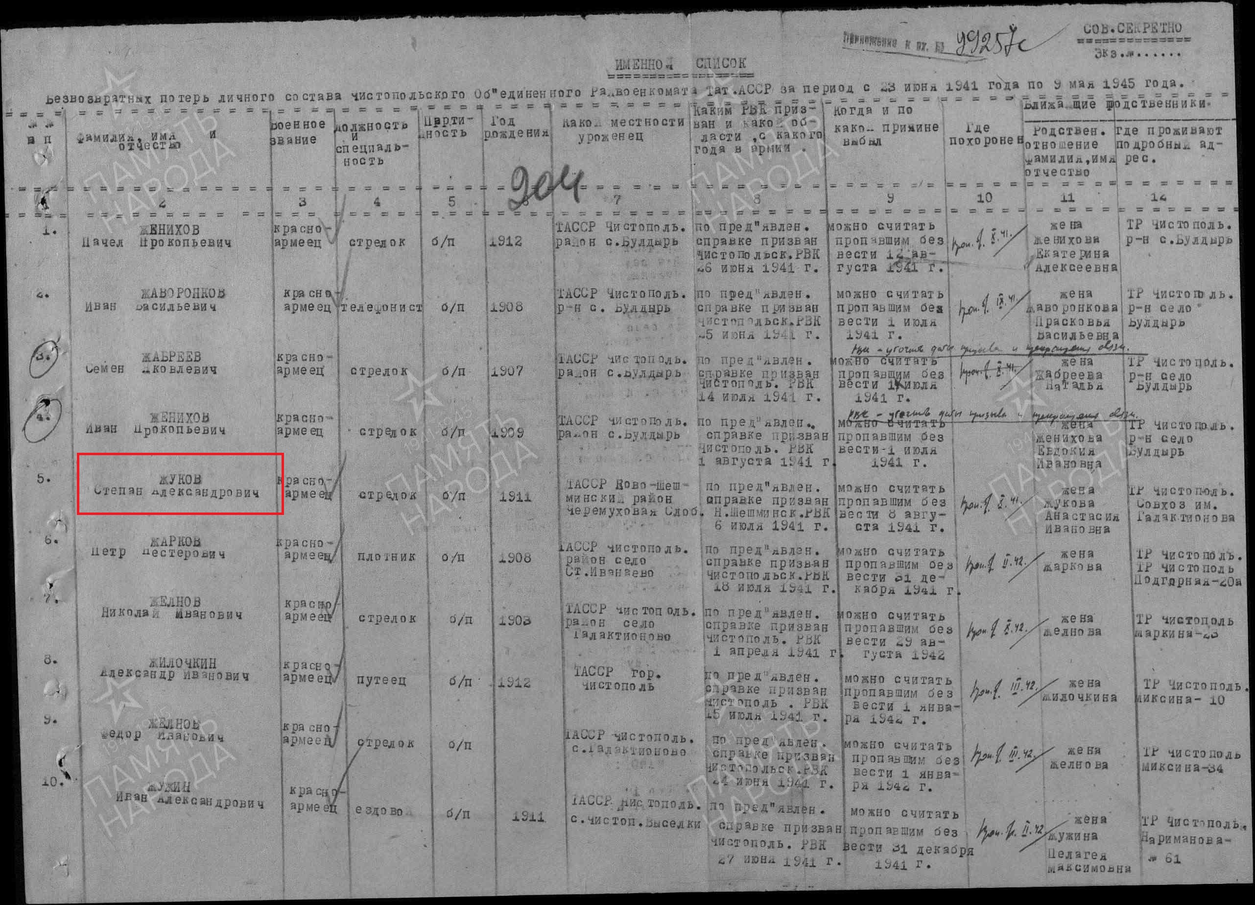 ЖУКОВ СТЕПАН АЛЕКСАНДРОВИЧ родился в 1911 году в с.Сл.Черемуховая Казанской губернии Чистопольского уезда Новошешминской волости (ныне с.Слобода Черемуховая Новошешминского района РТ). Мобилизован Новошешминским РВК,кр-ц. Пропал без вести 01.10.41.г.