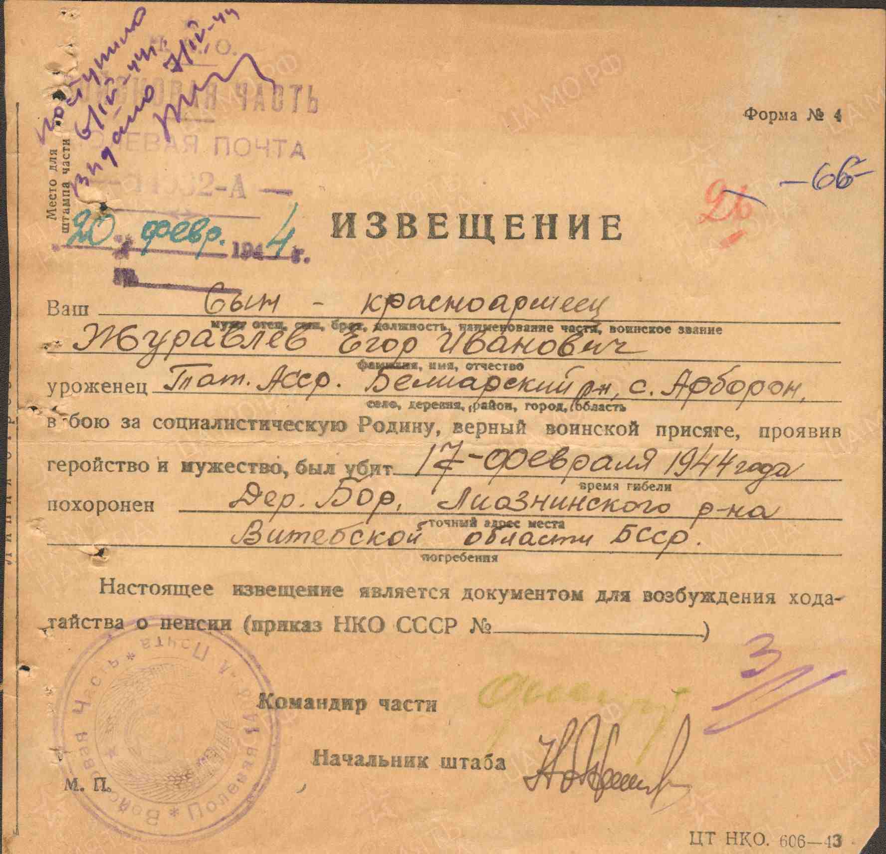 ЖУРАВЛЁВ Егор Иванович, 1925, с. Арбузов Баран. Мобилизован в нояб. 1943 Алексеевским РВК. Красноармеец, стрелок-автоматчик 338 СД 5 А Западного фронта. Участник освобождения Белоруссии. Погиб 17 фев. 1944, д. Бор., Лиозненский р-н, Витебская обл., Белорусская ССР.