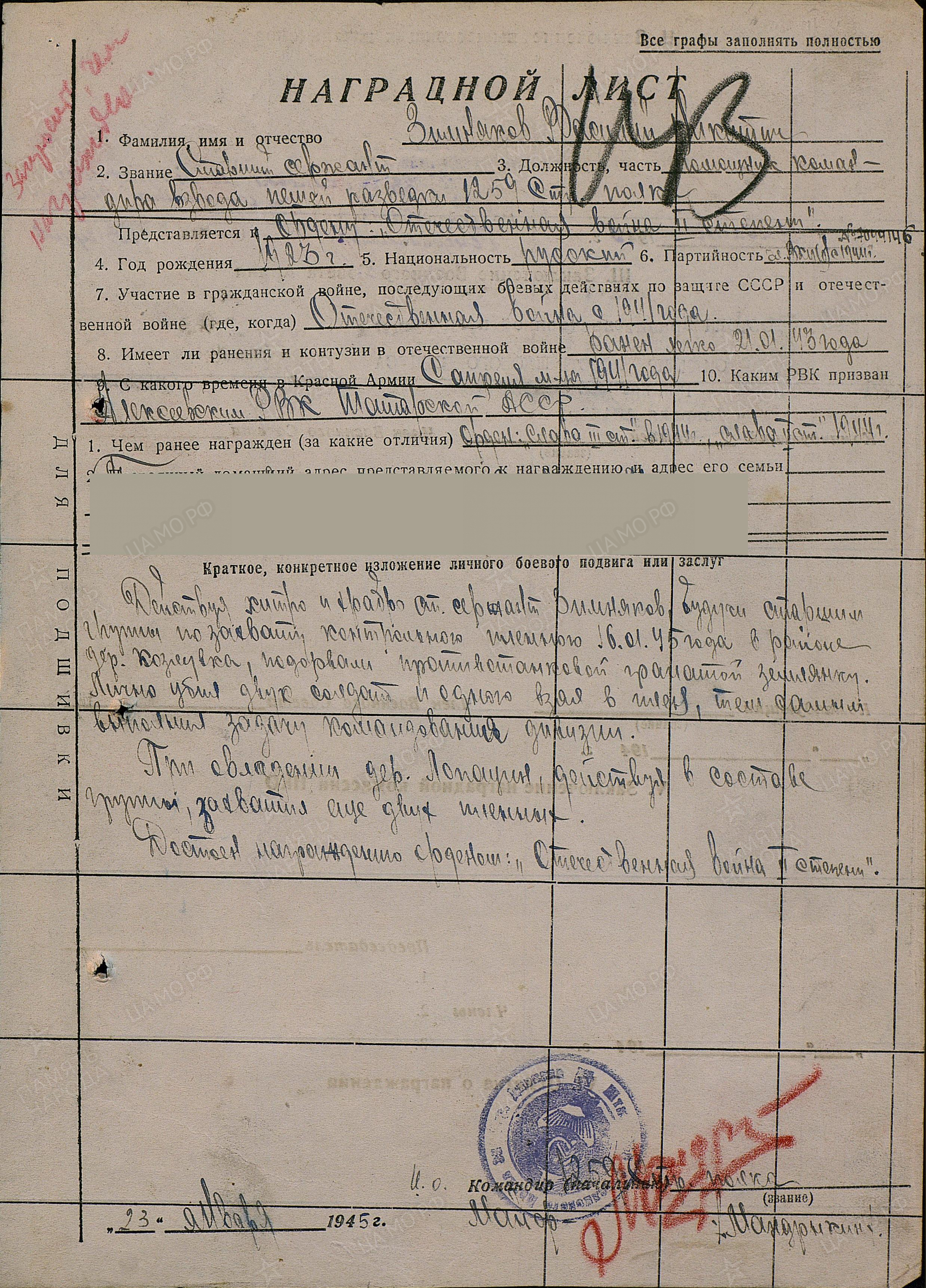 ЗИМНЯКОВ Василий Никитович,1923, с. Мурзиха. Мобилизован Алексеевским РВК 13 апр.1941. На Великой Отечественной войне с 12 июня 1942. Воевал на Кавказе. 21 марта 1943 под Туапсе был ранен. В 1944 - ст. сержант, ком. отделения разведчиков, пом. ком. взвода пешей разведки 1259 СП 381 СД 23 А ЛенФ и 2 УдА 2 БелФ, воевал на Карельском перешейке и Вост. Пруссии. Награждён орденами Славы 3 и 2 ст., медалью «За отвагу» (представлялся к ордену Отечественной войны 2 ст.).